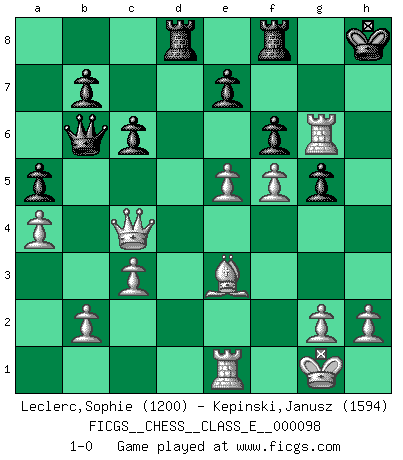 Last move : 1-0 2009 May 12 19:58:19 [Event "FICGS__CHESS__CLASS_E__000098"] [Site "FICGS"] [Date "2008.12.06"] [Round "1"] [White "Leclerc,Sophie"] [Black "Kepinski,Janusz"] [Result "1-0"] [WhiteElo "1200"] [BlackElo "1594"] 1.f4 d5 2.Nf3 g6 3.e3 Bg7 4.d4 Bg4 5.Be2 Nf6 6.O-O O-O 7.Ne5 Bxe2 8.Qxe2 Nbd7 9.Nc3 c6 10.Bd2 Qc7 11.a4 Ne8 12.e4 dxe4 13.Nxe4 Nd6 14.c3 Nxe4 15.Qxe4 Rad8 16.Qe2 a5 17.Rf3 f6 18.Qc4+ Kh8 19.Nxg6+ hxg6 20.Rh3+ Bh6 21.f5 g5 22.Rxh6+ Kg7 23.Rg6+ Kh8 24.Re1 Ne5 25.dxe5 Qb6+ 26.Be3 1-0 Bird's Opening Kingside Castling by player White (move 6) Kingside Castling by player Black (move 6) Player White won this chess game. Follow this game move after move (download)In the perfect Chess combination as in a first-rate short story, the whole plot and counter-plot should lead up to a striking finale, the interest not being allayed until the very last moment. (Yates and Winter) Der Schachmeister von Heute braucht Courage, einen Killerinstinkt, Ausdauer und Arroganz. (Larry Evans) Ciertamente, de todas la drogas del mundo, el Ajedrez debe ser el mas placentero permamentemente. (Assiac) Un journaliste : 'Vous préférez avoir une dame de plus sur l'échiquier ou au lit ?' Boris Spassky : 'Ca dépend de la position.' Warrior pose battles inner weakness and wins focus. You see that there is no war within you. You're on your own side, and you are your own strength. (Terri Guillemets)