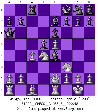 Last move : 0-1 2009 March 27 12:8:16 [Event "FICGS__CHESS__CLASS_E__000098"] [Site "FICGS"] [Date "2008.12.06"] [Round "1"] [White "Wingo,Cian"] [Black "Leclerc,Sophie"] [Result "0-1"] [WhiteElo "1400"] [BlackElo "1200"] 1.e4 c6 2.d4 d5 3.e5 Bf5 4.Nf3 Na6 5.c3 e6 6.Be2 Qb6 7.O-O Be7 8.Nbd2 c5 9.Qa4+ Kf8 10.Re1 cxd4 11.Nxd4 Nc5 12.Qd1 Nd3 13.Bxd3 Bxd3 14.N2f3 Be4 15.Qe2 Qa6 16.c4 Rc8 0-1 This chess game has been lost on time (started : 2008.12.06 22:12:4) Caro-Kann : Advance variation Kingside Castling by player White (move 7) Player Black won this chess game. Follow this game move after move (download)Fischer is completely natural. He plays no roles. He's like a child. Very, very simple. (Zita Rajcsanyi) Man braucht nicht immer den besten Zug zu spielen: Ein Zug muß aktiv, unternehmungslustig, korrekt und schön sein. (David Bronstein) ¿Esta Bobby Fischer algo cuerdo?. (Salo Flohr) Toutes les manuvres exécutées sur une colonne ouverte ont pour but ultime l'intrusion définitive sur la septième ou la huitième rangée, en plein cur de la position ennemie. (Aaron Nimzovitch) The Movers & Shakers of this world are those who play chess in the mornings and go to the disco in the evenings. (Dinesh De Silva)