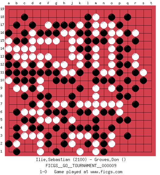 Last move : 1-0 2006 October 3 22:55:38 [Event "FICGS__GO__TOURNAMENT__000009"] [Site "FICGS"] [Date "2006.08.21"] [Round "1"] [Black "Ilie,Sebastian"] [White "Groves,Don"] [Result "1-0"] [Rating 1 "2100"] 1.q16 d16 2.q3 e5 3.d4 o5 4.q5 e3 5.e4 o17 6.q14 f13 7.l17 o15 8.l15 o3 9.f3 g3 10.f2 g2 11.g4 h4 12.h3 j3 13.h2 g5 14.g1 j2 15.h5 j5 16.j4 l3 17.k4 k3 18.l4 k5 19.m4 l5 20.m3 m1 21.n2 m2 22.n3 o2 23.n1 k1 24.l2 n4 25.m5 d14 26.p17 r16 27.r15 c4 28.c5 e2 29.b4 c3 30.b3 d3 31.d5 f5 32.h6 h7 33.g6 g7 34.f6 e6 35.f7 e7 36.f8 j6 37.j7 k7 38.j8 m6 39.l6 l7 40.k6 j5 41.n6 n7 42.m7 n5 43.o6 p6 44.p5 o7 45.o4 j15 46.l13 j13 47.h17 f17 48.g16 h16 49.g17 g15 50.f16 j16 51.j17 f15 52.e16 e15 53.d17 k17 54.k16 c17 55.c16 b16 56.c15 b2 57.a2 d6 58.e8 d8 59.d9 c9 60.c8 c6 61.b6 e9 62.d10 e10 63.c10 d11 64.c11 c12 65.b12 b11 66.b10 b9 67.d7 a10 68.a11 b13 69.c13 d13 70.d12 e12 71.e11 c14 72.b15 b14 73.b17 a15 74.a16 a14 75.f11 g12 76.g11 h11 77.h10 h12 78.k11 p7 79.r7 q9 80.q8 m8 81.p9 m9 82.n10 m6 83.m10 m7 84.k9 o9 85.o10 p10 86.p8 q11 87.r9 o12 88.p12 o11 89.p13 o13 90.p11 m14 91.l14 m16 92.l16 n11 93.m11 m13 94.o18 p16 95.p15 o16 96.q18 o14 97.p14 r10 98.q10 r13 99.r11 s11 100.s10 r12 101.q12 d15 102.c18 c12 103.d11 a12 104.b11 c13 105.g10 j11 106.j10 k12 107.l12 k13 108.k14 j14 109.f12 e13 110.a13 m12 111.m15 m17 112.n15 k15 113.a12 m18 114.n16 n17 115.l18 e1 116.b1 1-0 Here are the names of the openings (joseki) played in the four corners : Corner d4 : e5 d4 Go-no-go (Wu~wu~) 5-5 Point. The 5-5 was experimented with briefly during the "New Fuseki" movement in Japan in the 1930s. The 5-5 point has not retained popularity because the 4-4 hoshi (star) point strikes a better balance between influence and territory. As one can see from the variations, though, the 5-5 is playable. Corner q4 : q3 o5 Komoku (Somok, Xiao~mu`) 3-4 Point. The komoku (3-4) point is the traditional corner enclosure move.. Corner q16 : q16 o17 Hoshi (Hwajeom, Seongjeom, Xingwei`) 4-4 Point. The star or hoshi (4-4) point, emphasizing influence at the potential expense of territory. Ikken Kakari (Hankan Keolch'im, Yi Gua`jiao~, 1-Space Low Approach). White 2 is the standard approach move to the 4-4. Player Black won this Go (weiqi, baduk) game. Follow this game move after move (download)The monkey jump is worth eight points. (Anonymous) Follow your passion, and success will follow you. (Arthur Buddhold)