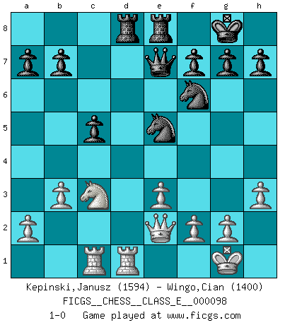 Last move : 1-0 2009 May 10 17:29:36 [Event "FICGS__CHESS__CLASS_E__000098"] [Site "FICGS"] [Date "2008.12.06"] [Round "1"] [White "Kepinski,Janusz"] [Black "Wingo,Cian"] [Result "1-0"] [WhiteElo "1594"] [BlackElo "1400"] 1.d4 d5 2.c4 dxc4 3.e3 e5 4.Bxc4 exd4 5.Nf3 Bb4+ 6.Bd2 Bxd2+ 7.Qxd2 Nf6 8.Nxd4 O-O 9.O-O Re8 10.Rd1 Qe7 11.b3 Nbd7 12.Nc3 Ne5 13.Be2 Bd7 14.Rac1 Rad8 15.h3 c5 16.Ndb5 Bxb5 17.Qc2 Bxe2 18.Qxe2 1-0 This chess game has been lost on time (started : 2008.12.06 22:12:4) Queen's gambit accepted Kingside Castling by player Black (move 8) Kingside Castling by player White (move 9) Player White won this chess game. Follow this game move after move (download)Chess is a more highly symbolic game, but the aggressions are therefore even more frankly represented in the play. It probably began as a war game; that is, the representation of a miniature battle between the forces of two kingdoms. (Karl Meninger) Den Ruhm habe ich schon, jetzt brauche ich noch das Geld. (Wilhelm Steinitz) Solo existe una cosa que Fischer hace en el Ajedrez sin placer: ¡perder!. (Boris Spassky) Les échecs sont plus proches de l'art de l'assassinat que de l'art de la guerre. (Arturo Perez-Reverte) When you've done things right people won't know you've done anything at all. (Futurama)