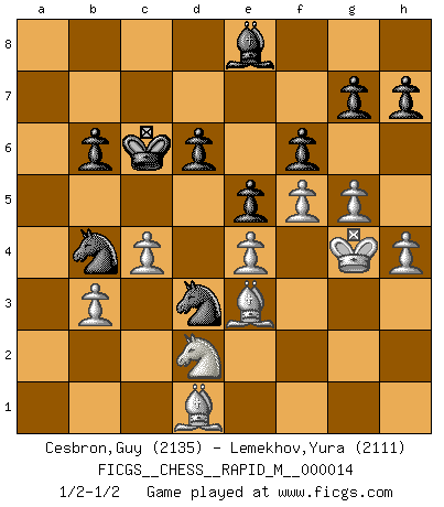 Last move : 1/2-1/2 2009 May 1 0:27:25 [Event "FICGS__CHESS__RAPID_M__000014"] [Site "FICGS"] [Date "2008.12.07"] [Round "1"] [White "Cesbron,Guy"] [Black "Lemekhov,Yura"] [Result "1/2-1/2"] [WhiteElo "2135"] [BlackElo "2111"] 1.e4 c5 2.Nf3 d6 3.d4 cxd4 4.Nxd4 Nf6 5.f3 e5 6.Nb3 Be6 7.c4 a5 8.Be3 Be7 9.Nc3 a4 10.Nd2 Qa5 11.Be2 O-O 12.O-O Bd8 13.Kh1 Nc6 14.Nd5 Rc8 15.b3 Ra8 16.Rb1 axb3 17.axb3 Qa3 18.Ra1 Qxa1 19.Qxa1 Rxa1 20.Rxa1 Nd7 21.g3 Ba5 22.Ne7+ Nxe7 23.Rxa5 Nc6 24.Ra3 Nc5 25.f4 f6 26.f5 Bc8 27.Kg2 b6 28.h4 Bb7 29.Bf3 Nb4 30.Bf2 Kf7 31.g4 Ra8 32.Rxa8 Bxa8 33.g5 Bb7 34.Kg3 Bc6 35.Be3 Nc2 36.Bf2 Ke7 37.Bg1 Kd7 38.Kg4 Ke7 39.Bf2 Be8 40.Bd1 Nb4 41.Be2 Kd7 42.Be3 Kc6 43.Bd1 Ncd3 1/2-1/2 Sicilian : Prins (Moscow) variation Kingside Castling by player Black (move 11) Kingside Castling by player White (move 12) This chess game ended in a draw. Follow this game move after move (download)I prefer to lose a really good game than to win a bad one. (David Levy) Charakterschwächen offenbaren sich normalerweise während einer Schachpartie. (Garry Kasparov) Las combinaciones han sido siempre el aspecto más intrigante del Ajedrez. Los Maestros las buscan, el público las aplauden, los críticos las alaban. La razón se debe a que las combinaciones hacen posible que el Ajedrez sea más que un ejercicio matemático con una carencia de vida. Ellas son la poesía del juego, son del Ajedrez lo que la melodía es de la música. Ellas representan el triunfo de la mente sobre la materia. (Reuben Fine) Fischer est le meilleur joueur du monde et Karpov n'est qu'un joueur de bistrot. (Garry Kasparov, agé de 16 ans) May the force be with you. (Han Solo in Star Wars ep.4)