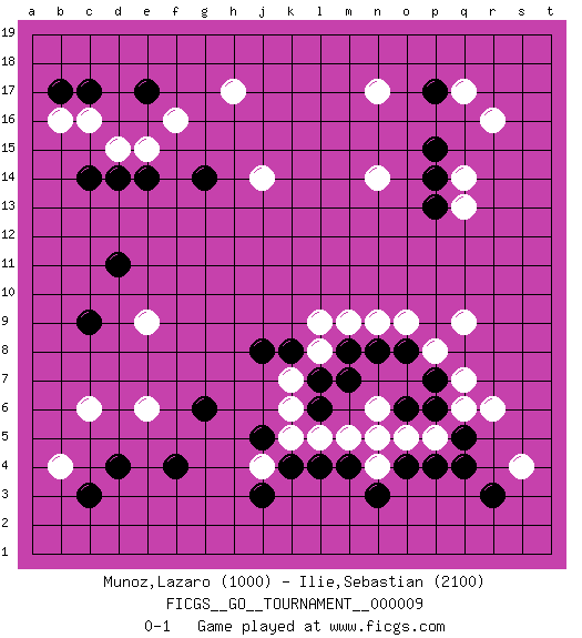 Last move : 0-1 2006 October 26 15:18:40 [Event "FICGS__GO__TOURNAMENT__000009 "] [Site "FICGS"] [Date "2006.08.21"] [Round "1"] [Black "Munoz,Lazaro "] [White "Ilie,Sebastian "] [Result "0-1"] [Rating 1 "1000"] [Rating 2 "2100"] 1.d4 c16 2.q4 r16 3.k4 r6 4.o4 s4 5.r3 q9 6.e17 h17 7.c14 d15 8.d14 f16 9.e14 c6 10.p17 n17 11.p15 q14 12.p14 q13 13.p13 q17 14.c9 e6 15.f4 b4 16.c3 e9 17.d11 n14 18.p6 q7 19.p7 p8 20.o8 o9 21.n8 n9 22.m8 m9 23.c17 b16 24.b17 e15 25.g14 j14 26.g6 l8 27.l7 k7 28.l6 k6 29.k8 l9 30.j8 l5 31.m7 k5 32.l4 m5 33.m4 n5 34.o6 n4 35.n3 j4 36.j3 o5 37.p4 p5 38.q5 q6 39.j5 n6 0-1 Comment by player 1 : Lazaro Munoz :Thanks for the game. Here are the names of the openings (joseki) played in the four corners : Corner q4 : q4 r6Hoshi (Hwajeom, Seongjeom, Xingwei`) 4-4 Point. The star or hoshi (4-4) point, emphasizing influence at the potential expense of territory.Ikken Kakari (Hankan Keolch'im, Yi Gua`jiao~, 1-Space Low Approach). White 2 is the standard approach move to the 4-4. Corner d16 : c16 e17Komoku (Somok, Xiao~mu`) 3-4 Point. The komoku (3-4) point is the traditional corner enclosure move..Ikken Kakari (Hankan Keolch'im, Yi Gua`jiao~, 1-Space Low Pincer). The small knight move is the basic approach move to the 3-4 point stone. It has been continually used for over four centuries. There are limitless variations, with new moves constantly being discovered. Black 2 opens the door to a treaure store of joseki. Corner d4 : d4 c6Hoshi (Hwajeom, Seongjeom, Xingwei`) 4-4 Point. The star or hoshi (4-4) point, emphasizing influence at the potential expense of territory.Ikken Kakari (Hankan Keolch'im, Yi Gua`jiao~, 1-Space Low Approach). White 2 is the standard approach move to the 4-4. Corner q16 : r16 p17Komoku (Somok, Xiao~mu`) 3-4 Point. The komoku (3-4) point is the traditional corner enclosure move..Ikken Kakari (Hankan Keolch'im, Yi Gua`jiao~, 1-Space Low Pincer). The small knight move is the basic approach move to the 3-4 point stone. It has been continually used for over four centuries. There are limitless variations, with new moves constantly being discovered. Black 2 opens the door to a treaure store of joseki. Player White won this Go (weiqi, baduk) game.Follow this game move after move (download ) On the third line, four die, six live. (Anonymous) Memory is a way of holding onto the things you love, the things you are, the things you never want to lose. (from the television show: The Wonder Years)