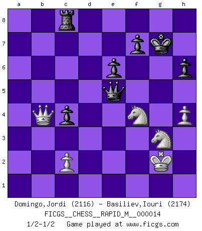 Last move : 1/2-1/2 2009 March 17 2:1:1 [Event "FICGS__CHESS__RAPID_M__000014"] [Site "FICGS"] [Date "2008.12.07"] [Round "1"] [White "Domingo,Jordi"] [Black "Basiliev,Iouri"] [Result "1/2-1/2"] [WhiteElo "2116"] [BlackElo "2174"] 1.e4 c5 2.Nf3 d6 3.d4 cxd4 4.Nxd4 Nf6 5.Nc3 a6 6.Be3 e6 7.Qd2 b5 8.f3 Nbd7 9.g4 Nb6 10.a4 Nc4 11.Bxc4 bxc4 12.a5 Bb7 13.Na4 d5 14.g5 Nd7 15.exd5 Bxd5 16.O-O Qc7 17.Nf5 h6 18.gxh6 gxh6 19.Bf4 Rg8+ 20.Kh1 Ne5 21.Qe3 Nxf3 22.Rxf3 Qxa5 23.Ng3 Rd8 24.h3 Bg7 25.Kh2 Bxf3 26.Qxf3 Be5 27.Nc3 Qxa1 28.Qc6+ Ke7 29.Bxe5 Qa5 30.Qb7+ Rd7 31.Bf6+ Kxf6 32.Qxd7 Qe5 33.Nce2 Rb8 34.Qc6 Qd5 35.Qxa6 Rxb2 36.Qa1 Qe5 37.Kg2 Kg7 38.h4 Rb5 39.Qa4 Rc5 40.Qb4 Rc8 41.Nf4 1/2-1/2 Sicilian : Najdorf, Byrne (English) attack Kingside Castling by player White (move 16) This chess game ended in a draw. Follow this game move after move (download)I played Chess with him and would have beaten him sometimes only he always took back his last move, and ran the game out differently. (Mark Twain) Wenn ich gewinne bin ich ein Genie. Wenn nicht, dann bin ich keines. (Robert James Fischer) Hoy en día, si tu no eres un Gran Maestro a los 14 años, es mejor que lo olvides. (Anand Viswanathan) Votre seul travail dans les ouvertures est d'obtenir un milieu de partie jouable. (Lajos Portish) There is a computer disease that anybody who works with computers knows about. It's a very serious disease and it interferes completely with the work. The trouble with computers is that you 'play' with them ! (Richard P. Feynman)