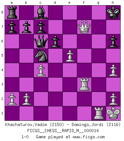 Last move : 1-0 2009 February 27 9:10:35 [Event "FICGS__CHESS__RAPID_M__000014"] [Site "FICGS"] [Date "2008.12.07"] [Round "1"] [White "Khachaturov,Vadim"] [Black "Domingo,Jordi"] [Result "1-0"] [WhiteElo "2150"] [BlackElo "2116"] 1.e4 e5 2.Nf3 f5 3.Nxe5 Qf6 4.d4 d6 5.Nc4 fxe4 6.Nc3 Qg6 7.f3 Nf6 8.fxe4 Be7 9.e5 Ng4 10.Bd3 Qh5 11.Nd5 Bh4+ 12.g3 O-O 13.Be4 Nc6 14.Nf4 Rxf4 15.Bxf4 Qf7 16.Qf3 Nxd4 17.Qd3 Ne6 18.O-O Nc5 19.Bxh7+ Kh8 20.Qg6 Qxc4 21.Qh5 Nh6 22.Bxh6 Qd4+ 23.Kh1 Qd5+ 24.Rf3 gxh6 25.c4 Qc6 26.gxh4 Kxh7 27.Qf7+ Kh8 28.Rg1 1-0 Latvian counter-gambit Kingside Castling by player Black (move 12) Kingside Castling by player White (move 18) Player White won this chess game. Follow this game move after move (download)A big shock; the best chess player in history has passed away. (Lajos Portisch, about Bobby Fischer's death) In Buenos Aires ist es nicht mein vorrangiges Ziel ein starkes Turnier zu organisieren, sondern ein Turnier für Gentlemen. Ich würde nie Kamsky einladen. Ich mag keine Probleme. (Miguel Najdorf) La maestría del Ajedrez consiste esencialmente en analizar posiciónes de Ajedrez con precisión. (Mikhail Botvinnik) Toutes les manuvres exécutées sur une colonne ouverte ont pour but ultime l'intrusion définitive sur la septième ou la huitième rangée, en plein cur de la position ennemie. (Aaron Nimzovitch) At work, the authority of a person is inversely proportional to the number of pens that person is carrying. (Dan Rotaru)