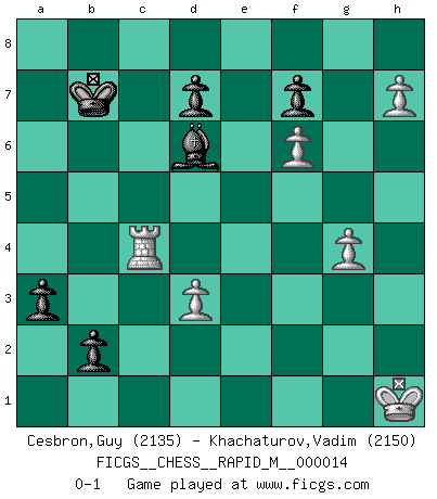 Last move : 0-1 2009 April 23 0:50:7 [Event "FICGS__CHESS__RAPID_M__000014"] [Site "FICGS"] [Date "2008.12.07"] [Round "1"] [White "Cesbron,Guy"] [Black "Khachaturov,Vadim"] [Result "0-1"] [WhiteElo "2135"] [BlackElo "2150"] 1.e4 c5 2.Nf3 Nc6 3.d4 cxd4 4.Nxd4 Nf6 5.Nc3 e5 6.Nde2 Bb4 7.a3 Ba5 8.f3 O-O 9.Bg5 h6 10.Bh4 Re8 11.Qc1 Qe7 12.b4 Bd8 13.Nd5 Qd6 14.Bxf6 Bxf6 15.Qe3 Bd8 16.Nec3 a6 17.Rd1 Nd4 18.Qf2 b5 19.f4 Nc6 20.f5 Nd4 21.Bd3 Bb7 22.O-O Rc8 23.Qg3 Kh8 24.Kh1 Bg5 25.f6 gxf6 26.Ne2 Bxd5 27.Nxd4 Be6 28.Nf5 Bxf5 29.Rxf5 Qb6 30.Qf3 Rc3 31.g3 Kg7 32.Qg4 Kf8 33.Rdf1 Re6 34.Qe2 Ke7 35.Re1 Rd6 36.Rf3 h5 37.h4 Bh6 38.Rf5 Bc1 39.Qxh5 Bxa3 40.Rxe5+ Re6 41.Rxe6+ Qxe6 42.g4 Bxb4 43.e5 Kd8 44.Re4 a5 45.Qh8+ Kc7 46.exf6 Qc6 47.Qh5 Rxd3 48.cxd3 a4 49.Qe5+ Bd6 50.Qd4 Kb7 51.h5 a3 52.h6 b4 53.h7 b3 54.Qc4 Qxc4 55.Rxc4 b2 0-1 Sicilian : Pelikan (Lasker/Sveshnikov) variation Kingside Castling by player Black (move 8) Kingside Castling by player White (move 22) Player Black won this chess game. Follow this game move after move (download)By this measure (on the gap between Fischer & his contemporaries), I consider him the greatest world champion. (Garry Kasparov) Du kannst im Schach nur gut werden, wenn du das Spiel liebst. (Robert James Fischer) El ganar no lo es todo... pero el perder es nada. (Mednis) Les échecs sont un jeu par leur forme, un art par leur essence et une science par sa difficulté d'acquisition. Ils peuvent vous procurer autant de plaisir qu'un bon livre ou une belle musique, mais vous n'aurez une réelle joie que si vous arrivez à bien jouer. (Tigran Petrosian) Art disturbs, science reassures. (Georges Braque, Le Jour et la Nuit)