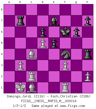 Last move : 1/2-1/2 2009 March 13 12:7:26 [Event "FICGS__CHESS__RAPID_M__000014"] [Site "FICGS"] [Date "2008.12.07"] [Round "1"] [White "Domingo,Jordi"] [Black "Koch,Christian"] [Result "1/2-1/2"] [WhiteElo "2116"] [BlackElo "2186"] 1.e4 c5 2.Nf3 d6 3.d4 cxd4 4.Nxd4 Nf6 5.Nc3 a6 6.Be3 e5 7.Nb3 Be6 8.f3 Be7 9.Qd2 O-O 10.O-O-O Nbd7 11.g4 b5 12.g5 Nh5 13.Nd5 Bxd5 14.exd5 f6 15.gxf6 Bxf6 16.Na5 Nf4 17.Nc6 Qc7 18.c4 Nb8 19.Qa5 Qxa5 20.Nxa5 Nd7 21.Kb1 bxc4 22.Nxc4 Be7 23.Nd2 Kh8 24.Ne4 Nf6 25.Nxf6 Rxf6 26.Rg1 a5 27.Bc4 g6 28.Rc1 Rf5 29.Rc2 Rc8 30.Rd1 Rh5 31.b3 Rh3 32.Rf1 Bg5 33.Bb6 Bd8 34.Be3 Kg7 35.Kb2 Bg5 36.Bg1 Bf6 37.Kb1 Rb8 38.Ba6 Be7 39.Bc4 Rh4 40.Ba7 Rb7 41.Be3 a4 42.Bc1 Bd8 43.Ba3 axb3 44.axb3 Be7 45.Bc1 Kf6 46.Ba3 Kg7 47.Bc1 Kf6 1/2-1/2 Sicilian : Najdorf, Byrne (English) attack Kingside Castling by player Black (move 9) Queenside Castling by player White (move 10) This chess game ended in a draw. Follow this game move after move (download)Your body has to be in top condition. Your Chess deteriorates as your body does. You can't separate body from mind. (Bobby Fischer) Mit Schach schule ich mein Gefühl für Geometrie, was für Tennis und Schach gleichermaßen wichtig ist. (Boris Becker) Cuando tu no sabes absolutamente que mas hacer, es tiempo de entrar en pánico. (John van der Wiel) Même un GMI sait rarement calculer sur plus de cinq coups une attaque à sacrifices. (Rudolf Spielmann) The worth of a book is to be measured by what you can carry away from it. (James Bryce)