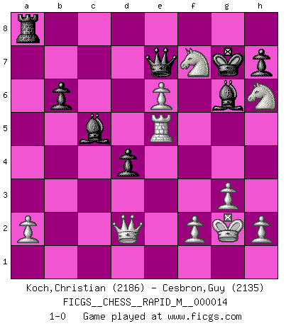 Last move : 1-0 2009 February 14 13:38:14 [Event "FICGS__CHESS__RAPID_M__000014"] [Site "FICGS"] [Date "2008.12.07"] [Round "1"] [White "Koch,Christian"] [Black "Cesbron,Guy"] [Result "1-0"] [WhiteElo "2186"] [BlackElo "2135"] 1.e4 e6 2.c3 d5 3.e5 c5 4.Nf3 Nc6 5.d4 Nh6 6.Bd3 f6 7.exf6 Qxf6 8.Bg5 Qf7 9.O-O cxd4 10.cxd4 Bd6 11.Bxh6 gxh6 12.Nc3 O-O 13.Bb5 Qg7 14.Kh1 Bd7 15.Bxc6 bxc6 16.Rc1 Kh8 17.Re1 Be8 18.Ne2 Bh5 19.Neg1 Rf6 20.Rxc6 Rg8 21.g3 Qd7 22.Ra6 Rb8 23.Kg2 Rxb2 24.Qc1 Rb6 25.Rxb6 axb6 26.Ne5 Qe8 27.Nh3 Bg6 28.Ng4 Rf7 29.Nxh6 Rf8 30.Ng5 e5 31.dxe5 Bc5 32.Re2 d4 33.e6 Qe7 34.Qd2 Kg7 35.Ngf7 Ra8 36.Re5 1-0 French defense Kingside Castling by player White (move 9) Kingside Castling by player Black (move 12) Player White won this chess game. Follow this game move after move (download)He who takes the Queen's Knight's Pawn will sleep in the streets. (Anonymous) Das ganze Leben mit einer Ehefrau ist wie ein Endspiel mit ungleichfarbigen Läufern. (Viktor Kortschnoi) Dios mío, Bobby Fischer juega tan simple. (Alexei Suetin) Psychologiquement, tu dois avoir confiance en toi même, mais cette confiance doit être basée sur des faits. (Robert Fischer) Locking firmely the window serves nothing, only small thiefs pass through there, the big thiefs enter through the front door. (Luc-Olivier Leclerc)