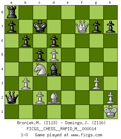 Last move : 1-0 2009 February 27 11:46:28 [Event "FICGS__CHESS__RAPID_M__000014"] [Site "FICGS"] [Date "2008.12.07"] [Round "1"] [White "Broniek,Mariusz Maciej"] [Black "Domingo,Jordi"] [Result "1-0"] [WhiteElo "2113"] [BlackElo "2116"] 1.e4 e5 2.Nf3 f5 3.Nxe5 Qf6 4.d4 d6 5.Nc4 fxe4 6.Nc3 Qg6 7.Ne3 Nf6 8.f3 Be7 9.fxe4 Nxe4 10.Nxe4 Qxe4 11.Bd3 Qh4+ 12.g3 Qh3 13.Bf1 Qd7 14.Bc4 c6 15.O-O Bf6 16.Bb3 Kd8 17.Qd3 b6 18.d5 c5 19.Bd2 Kc7 20.Rae1 Re8 21.Nc4 Rxe1 22.Rxe1 Bd4+ 23.Kh1 Nc6 24.Ba4 Ne5 25.Rxe5 Qxa4 26.Re7+ Bd7 27.b3 Qxa2 28.Rxd7+ Kxd7 29.Qf5+ Kc7 30.Qf7+ 1-0 Latvian counter-gambit Kingside Castling by player White (move 15) Player White won this chess game. Follow this game move after move (download)Is Bobby Fischer quite sane ? (Salo Flohr) Irgendwie scheint mir sonntags früh um 9 Uhr der Killerinstinkt verloren gegangen zu sein. (Alexej Shirov) El Ajedrez es en su esencia, un juego. En su forma, un arte. Y en su ejecución, una ciencia. (Baron Tassilo) Un millionnaire : 'Monsieur Steinitz ! Vous ne participez aux tournois que pour l'argent, alors que moi je n'y viens que pour l'honneur.' Steinitz : 'Chacun joue pour ce qu'il n'a pas'... Whenever people agree with me, I always feel I must be wrong. (Oscar Wilde)
