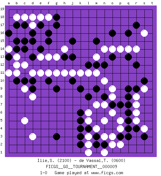 Last move : 1-0 2006 December 2 3:58:27 [Event "FICGS__GO__TOURNAMENT__000009"] [Site "FICGS"] [Date "2006.08.21"] [Round "1"] [Black "Ilie,Sebastian"] [White "de Vassal,Thibault"] [Result "1-0"] [Rating 1 "2100"] [Rating 2 "0600"] 1.q16 d17 2.q3 d3 3.r9 c5 4.c14 c12 5.c17 c16 6.d16 b16 7.b17 e16 8.d15 d18 9.b15 b18 10.a16 c18 11.c15 e15 12.e14 e11 13.f15 d8 14.f16 f18 15.e17 e18 16.g17 r14 17.r12 p14 18.o16 n14 19.m15 s16 20.r17 m13 21.k3 r5 22.r4 n3 23.g3 n5 24.q5 r6 25.q6 r7 26.q7 r8 27.q9 s9 28.s10 s4 29.s3 n7 30.q8 m11 31.m9 k11 32.k9 o9 33.n8 o8 34.o7 n10 35.l8 m7 36.k6 l2 37.k2 p2 38.m2 p4 39.q4 l6 40.k5 o6 41.p7 l5 42.g18 p5 43.p3 o3 44.n2 o2 45.q13 q14 46.o13 o14 47.n12 h11 48.l12 l11 49.m12 l3 50.m3 l1 51.l4 m4 52.k4 n1 53.j10 j11 54.g9 g11 55.f10 f11 56.d9 c9 57.d10 d11 58.c10 h14 59.j15 f13 60.j13 b11 61.b10 b13 62.h13 g13 63.a12 a11 64.a13 e13 65.d13 a14 66.b14 b12 67.a13 1-0 Here are the names of the openings (joseki) played in the four corners : Corner d16 : d17 c14 Komoku (Somok, Xiao~mu`) 3-4 Point. The komoku (3-4) point is the traditional corner enclosure move.. Nikken Kakari (Dukan Keolch'im, E`r Gua`jiao~, 2-Space Low Approach). Black 2 is used with friendly forces backing it up. Its purpose is to prevent a pincer. Locally it results in a loss, but may be appropriate fuseki strategy. It was popular in the late 1950s and early 1960s, but is not seen often nowadays, having been replaced by the one-space high approach, with which it has points in common. Corner q16 : q16 r14 Hoshi (Hwajeom, Seongjeom, Xingwei`) 4-4 Point. The star or hoshi (4-4) point, emphasizing influence at the potential expense of territory. Ikken Kakari (Hankan Keolch'im, Yi Gua`jiao~, 1-Space Low Approach). White 2 is the standard approach move to the 4-4. Player Black won this Go (weiqi, baduk) game. Follow this game move after move (download)In an unreasonable situation, an unreasonable move is reasonable. (Tamino) Tree pose grows confidence. It roots me to this world. (Terri Guillemets)