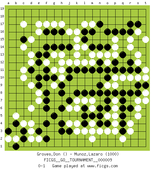 Last move : 0-1 2006 December 5 23:3:25 [Event "FICGS__GO__TOURNAMENT__000009"] [Site "FICGS"] [Date "2006.08.21"] [Round "1"] [Black "Groves,Don"] [White "Munoz,Lazaro"] [Result "0-1"] [Rating 2 "1000"] 1.q16 d4 2.q3 c17 3.f4 d6 4.f16 j4 5.c15 e17 6.j3 r14 7.r12 r10 8.p12 p14 9.o16 p10 10.r6 e16 11.f14 c10 12.e10 d13 13.e12 d15 14.q8 s16 15.s17 r15 16.r17 c14 17.h4 k4 18.h3 k3 19.f6 o3 20.q5 e2 21.g5 j16 22.l16 s12 23.s11 s13 24.r11 s10 25.q13 t11 26.q11 q10 27.o11 p15 28.p16 s7 29.s8 e8 30.f8 e7 31.f7 o5 32.o8 p7 33.o6 p6 34.o7 o9 35.p8 p5 36.n5 m6 37.n4 p3 38.n6 n3 39.m3 m4 40.l4 m2 41.m5 l3 42.l6 m7 43.m8 l7 44.l8 k6 45.l5 k7 46.k8 j6 47.n8 r3 48.q7 q2 49.q4 r4 50.q6 s6 51.r8 t8 52.h8 n13 53.m11 k14 54.t9 s5 55.n14 o13 56.n12 m13 57.m14 l14 58.l15 l12 59.l11 k12 60.k11 h12 61.h14 f17 62.g16 g17 63.h16 h17 64.e13 d12 65.d11 c11 66.e9 d9 67.j11 j12 68.g12 h11 69.g10 h10 70.j10 t7 71.s9 t10 72.o10 m4 73.o4 p4 74.r16 t15 75.n9 o12 76.p11 m12 77.n11 m3 78.c3 d3 79.c2 c4 80.b4 b5 81.a3 b2 82.b1 a2 83.e3 d2 84.f2 k16 85.j14 k13 86.h9 g13 87.g14 g11 88.f11 f12 89.f13 g9 90.f10 k15 91.h6 l17 92.o14 p13 93.n17 m17 94.m16 h13 95.j7 p9 0-1 Comment by player 2 : Lazaro Munoz : Your Spanish is better than mine. I live in NYC. I returned to the game this September. I had not played in over 20 years; been playing mostly chess. Here are the names of the openings (joseki) played in the four corners : Corner d4 : d4 f4 Hoshi (Hwajeom, Seongjeom, Xingwei`) 4-4 Point. The star or hoshi (4-4) point, emphasizing influence at the potential expense of territory. Ikken Takagakari (Hankan Nop'dakeolch'im, Yi Gaojia, 1-Space High Approach). White typically responds at 6-4 or 3-10. White 4-10 is played when White finds play on the right side advantageous. White 4-8 or 3-8 may be played when White has support at top. Corner d16 : c17 f16 San-San (Sam-Sam, San-San) 3-3 Point. The San-San (3-3) point, emphasizing territory at the expense of influence. Nikken Takagakari (Dukan Nop'dakeolch'im, E`r Gaogua`jiao~, 2-Space High Approach). White may continue with 4-5 or 4-6. White 4-6 works well when White is in the lower right (so an extension in the middle works both ways). The more conservative 4-5 is makes a slightly tighter shape (better for a fight). Corner q16 : q16 r14 Hoshi (Hwajeom, Seongjeom, Xingwei`) 4-4 Point. The star or hoshi (4-4) point, emphasizing influence at the potential expense of territory. Ikken Kakari (Hankan Keolch'im, Yi Gua`jiao~, 1-Space Low Approach). White 2 is the standard approach move to the 4-4. Player White won this Go (weiqi, baduk) game. Follow this game move after move (download)You can hide nothing on the goban. (Pierre Audouard) When the going gets tactical, the computers get going. (Hyatt)