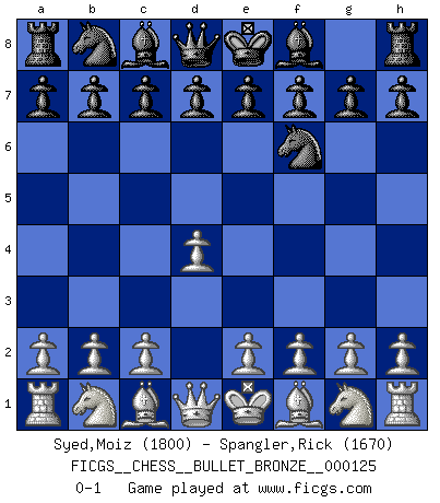Last move : 0-1 2008 December 7 15:43:35 [Event "FICGS__CHESS__BULLET_BRONZE__000125"] [Site "FICGS"] [Date "2008.12.07"] [Round "1"] [White "Syed,Moiz"] [Black "Spangler,Rick"] [Result "0-1"] [WhiteElo "1800"] [BlackElo "1670"] 1.d4 Nf6 0-1 This chess game has been lost on time (started : 2008.12.07 15:30:59) Queen's pawn game Player Black won this chess game. Follow this game move after move (download)Bobby is the finest Chess player this country ever produced. His memory for the moves, his brilliance in dreaming up combinations, and his fierce determination to win are uncanny. (John Collins) Schach ist Kampf, hauptsächlich jedoch gegen die eigenen Fehler. (Savielly Grigorievitsch Tartakower) Es el objetivo de la escuela moderna no tratar cada posición de acuerdo a una regla general, sino de acuerdo al principio inherente en la posición. (Richard Reti) Je ne suis pas le dernier à jouer lâchement des coups douteux pendant le zeïtnot de l'adversaire pour l'achever: en effet les coups qui font le plus peur sont ceux que l'on ne comprend pas. Je me fais souvent peur quand je joue. (Un professeur anonyme) Work expands to fill the time available. (C. Northcote Parkinson, in Parkinson's Laws)