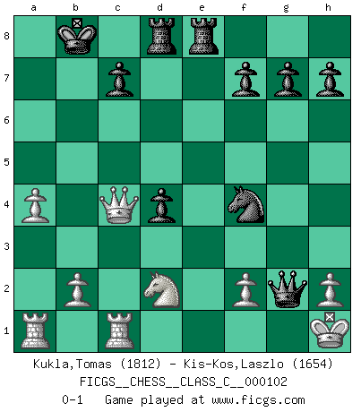 Last move : 0-1 2009 February 23 8:54:53 [Event "FICGS__CHESS__CLASS_C__000102"] [Site "FICGS"] [Date "2008.12.07"] [Round "1"] [White "Kukla,Tomas"] [Black "Kis-Kos,Laszlo"] [Result "0-1"] [WhiteElo "1812"] [BlackElo "1654"] 1.e4 e5 2.Nf3 Nc6 3.Bb5 a6 4.Ba4 Nf6 5.O-O Nxe4 6.d4 b5 7.Bb3 d5 8.dxe5 Be6 9.Nbd2 Nc5 10.c3 d4 11.Ng5 Qxg5 12.Qf3 O-O-O 13.Bxe6+ Nxe6 14.Qxc6 Qxe5 15.Qxa6+ Kb8 16.a4 b4 17.Nc4 Qe4 18.cxb4 Bxb4 19.Bd2 Bxd2 20.Nxd2 Qb7 21.Qc4 Rhe8 22.Rfc1 Nf4 23.Kh1 Qxg2+ 0-1 Ruy Lopez : Open, 7.Bb3 Kingside Castling by player White (move 5) Queenside Castling by player Black (move 12) Player Black won this chess game. Follow this game move after move (download)It is peculiar but a fact nevertheless, that gamblers in chess always have enthusiastic followers. (Botvinnik) Offensichtlich kennt Kasparow nichts anderes als Schach, und ich könnte 500 weitere Spieler dieser Sorte benennen. (Judith Polgar) Los asuntos humanos son como una partida de Ajedrez: solo aquellos que no lo toman seriamente, pueden ser llamados buenos jugadores. (Hung Tzu Ch'eng) Les ravages du H expliquent la différence de niveau entre Tal et Thal [Abergel]. God, you are such an idiot. - Actually, I thought I was more of a jerk. (Gregory House to Stacy Warner, House M.D.)