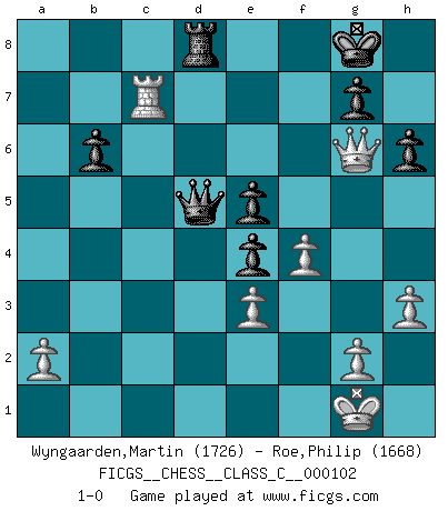 Last move : 1-0 2009 February 5 18:26:54 [Event "FICGS__CHESS__CLASS_C__000102"] [Site "FICGS"] [Date "2008.12.07"] [Round "1"] [White "Wyngaarden,Martin"] [Black "Roe,Philip"] [Result "1-0"] [WhiteElo "1726"] [BlackElo "1668"] 1.d4 Nf6 2.c4 Nc6 3.Nf3 e6 4.Nc3 Bb4 5.Qc2 O-O 6.Bg5 d6 7.e3 e5 8.Bd3 h6 9.Bxf6 Qxf6 10.O-O Bxc3 11.bxc3 Ne7 12.c5 Bg4 13.cxd6 cxd6 14.dxe5 dxe5 15.Bh7+ Kh8 16.Be4 Rac8 17.Qa4 b6 18.Qxa7 Rxc3 19.h3 Bf5 20.Bxf5 Nxf5 21.Rab1 Rc6 22.Rb5 e4 23.Ne5 Rd6 24.Qa4 Re8 25.Ng4 Qg6 26.Rxf5 Qxf5 27.Qxe8+ Kh7 28.f4 Qd5 29.Ne5 f6 30.Qg6+ Kg8 31.Rc1 fxe5 32.Rc8+ Rd8 33.Rc7 1-0 Kevitz-Trajkovich defense Kingside Castling by player Black (move 5) Kingside Castling by player White (move 10) Player White won this chess game. Follow this game move after move (download)There is only one thing Fischer does in Chess without pleasure: to lose ! (Boris Spassky) Zum Sieg gelangt man nicht, wenn man gut, sondern nur wenn man besser spielt (Savielly Grigorievitsch Tartakower) Aquel que ve no otra dirección en el juego que la de dar Jaque Mate a su oponente, nunca será un buen jugador de Ajedrez. (Euwe) Le thème de l'attaque double intervient d'une manière ou d'une autre dans l'immense majorité des combinaisons. (Youri Averbakh) Some people are so afraid to die that they never begin to live. (Henry Van Dyke)