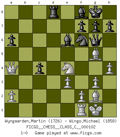 Last move : 1-0 2009 March 11 22:37:2 [Event "FICGS__CHESS__CLASS_C__000102"] [Site "FICGS"] [Date "2008.12.07"] [Round "1"] [White "Wyngaarden,Martin"] [Black "Wingo,Michael"] [Result "1-0"] [WhiteElo "1726"] [BlackElo "1858"] 1.d4 d5 2.c4 e6 3.Nc3 c5 4.cxd5 exd5 5.Nf3 Nc6 6.g3 Nf6 7.Bg2 Be7 8.O-O O-O 9.Bg5 c4 10.Ne5 Be6 11.Nxc6 bxc6 12.b3 Qa5 13.Qc2 Rfd8 14.e3 Rac8 15.bxc4 dxc4 16.Ne4 Qf5 17.Rab1 c5 18.Rb5 a6 19.Ra5 Qg6 20.dxc5 Rxc5 21.Rxc5 Bxc5 22.Qa4 Bf8 23.h4 1-0 QGD : Tarrasch, Prague variation, 7...Be7 Kingside Castling by player White (move 8) Kingside Castling by player Black (move 8) Player White won this chess game. Follow this game move after move (download)If a ruler does not understand Chess, how can he rule over a kingdom ? (King Khusros II) Der vorletzte Fehler gewinnt. (Savielly Grigorievitsch Tartakower) El estómago es una parte esencial del maestro de Ajedrez. (Bent Larsen) D'abord les bases : Jouez et étudiez, puis étudiez et jouez, ensuite jouez et étudiez, puis étudiez et jouez. Deuxièmement : Donnez toujours le meilleur de vous-même ! (Ken Smith) Computers are like Old Testament gods; lots of rules and no mercy. (Joseph Campbell)
