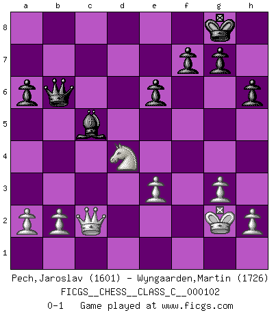 Last move : 0-1 2009 May 26 18:41:26 [Event "FICGS__CHESS__CLASS_C__000102"] [Site "FICGS"] [Date "2008.12.07"] [Round "1"] [White "Pech,Jaroslav"] [Black "Wyngaarden,Martin"] [Result "0-1"] [WhiteElo "1601"] [BlackElo "1726"] 1.d4 d5 2.c4 c6 3.Nf3 Nf6 4.Nc3 e6 5.e3 Nbd7 6.Bd3 dxc4 7.Bxc4 b5 8.Bd3 Bb7 9.O-O a6 10.e4 c5 11.e5 cxd4 12.Nxb5 Bxf3 13.Qxf3 Nd5 14.Nxd4 Nxe5 15.Qe2 Nxd3 16.Qxd3 Bc5 17.Be3 Nxe3 18.fxe3 O-O 19.Rac1 Rc8 20.Rf2 Qd6 21.Rfc2 Rc7 22.Qe4 Qb6 23.g3 Rfc8 24.Kg2 h6 25.Nb3 Be7 26.Nd4 Rxc2+ 27.Rxc2 Rxc2+ 28.Qxc2 Bc5 0-1 This chess game has been lost on time (started : 2008.12.07 17:50:21) QGD Slav : 4.Nc3 Kingside Castling by player White (move 9) Kingside Castling by player Black (move 18) Player Black won this chess game. Follow this game move after move (download)An attack on the wing should be met by play in the center. (Nimzovitch) Vielleicht wirkt die Aura früherer Spieler glanzvoller als die der heutigen Spieler, aber das liegt daran, dass man kein Programm wie Fritz hatte, das einem all die Löcher in ihren Partien zeigt. (Vladimir Kramnik) Las leyes del Ajedrez no permiten una libre elección: tienes que mover quieras o no. (Emanuel Lasker) C'est la seule position que je connaisse où les deux camps sont mals. Propos prêtés à V. Anand. A clear conscience is usually the sign of a bad memory. (Unknown)