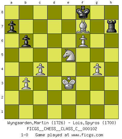 Last move : 1-0 2009 January 30 15:44:23 [Event "FICGS__CHESS__CLASS_C__000102"] [Site "FICGS"] [Date "2008.12.07"] [Round "1"] [White "Wyngaarden,Martin"] [Black "Lois,Spyros"] [Result "1-0"] [WhiteElo "1726"] [BlackElo "1700"] 1.d4 Nf6 2.c4 g6 3.g3 Bg7 4.Bg2 O-O 5.Nc3 d6 6.Nf3 Nbd7 7.O-O e5 8.e4 c6 9.b3 exd4 10.Nxd4 Ne5 11.Ba3 c5 12.Nde2 Re8 13.Qc2 Bg4 14.f3 Be6 15.Rad1 Qe7 16.f4 Nc6 17.f5 gxf5 18.exf5 Bd7 19.Qd2 Ng4 20.Ne4 Nd4 21.Bb2 Nxf5 22.Bxg7 Kxg7 23.Rf4 h5 24.h3 Nge3 25.g4 Qe5 26.gxf5 Nxd1 27.f6+ Kh7 28.Rh4 Rh8 29.Qxd1 Rae8 30.N2g3 Kg8 31.Qxd6 Bc6 32.Qxc5 Bxe4 33.Nxe4 Qxc5+ 34.Nxc5 b6 35.Nd7 Re1+ 36.Kf2 Ra1 37.Bf3 Rxa2+ 38.Ke3 Rh2 39.Bxh5 Rh7 40.Ne5 Rg2 41.Rg4+ Rxg4 42.hxg4 Kf8 43.Bxf7 1-0 Comment by player 2 : Spyros Lois : hi King's Indian : 3.g3 Kingside Castling by player Black (move 4) Kingside Castling by player White (move 7) Player White won this chess game. Follow this game move after move (download)Spassky will not be psyched out by Fischer. (Mike Goodall) Computer sind die einzigen Gegner, die nicht immer eine Ausrede auf Lager haben, wenn sie gegen mich verlieren. (Robert James Fischer) Ciertamente el estado mental actual de Bobby Fischer es una tragedia. Uno de los mas grandes jugadores de Ajedrez del mundo -el orgullo y pena del Ajedrez Americano. (Frank Brady) J'ai toujours senti une vague pitié pour l'homme qui ne connaît rien aux échecs, tout comme j'en aurais pour un homme ignorant de l'amour. Les Echecs, comme la musique ou comme l'amour, ont le pouvoir de rendre heureux. (Siegbert Tarrasch) Life is like a game of cards: the hand you are dealt represents determinism; the way you play it is free will. (Jawaharlal Nehru)