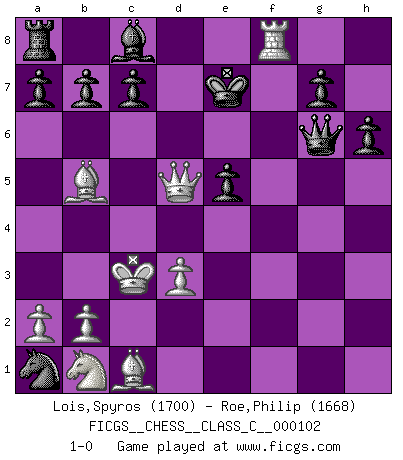 Last move : 1-0 2009 February 11 19:1:19 [Event "FICGS__CHESS__CLASS_C__000102"] [Site "FICGS"] [Date "2008.12.07"] [Round "1"] [White "Lois,Spyros"] [Black "Roe,Philip"] [Result "1-0"] [WhiteElo "1700"] [BlackElo "1668"] 1.e4 e5 2.Nf3 Nc6 3.Bc4 Nf6 4.Ng5 Bc5 5.Nxf7 Bxf2+ 6.Kxf2 Nxe4+ 7.Kg1 Qh4 8.g3 Nxg3 9.hxg3 Qxg3+ 10.Kf1 Rf8 11.Qe2 Nd4 12.Qg2 Qf4+ 13.Ke1 Nxc2+ 14.Kd1 Nxa1 15.d3 Qf5 16.Rf1 Qh5+ 17.Kd2 Qg6 18.Qd5 d6 19.Kc3 h6 20.Bb5+ Ke7 21.Nxe5 dxe5 22.Rxf8 1-0 Two knights defense : Wilkes Barre (Traxler) variation Player White won this chess game. Follow this game move after move (download)When you play Bobby, it is not a question if you win or lose. It is a question if you survive. (Boris Spassky) Es gibt zwei Arten von Opfern: Korrekte und meine. (Mikhail Nekhemyevich Tal) Los Peones son el alma de una partida de Ajedrez. (Francois Andre Danican Philidor) Il n'y a plus de joueurs du niveau de Jacob Murray dont la seule quête est le beau jeu, le plaisir de voir les pièces construire quelque chose. Sur 10 idées à la minute, 9 seront sans intérêt, la dernière s'avèrera géniale. (Christian Bauer) Men never do evil so completely and cheerfully as when they do it from religious conviction. (Blaise Pascal)