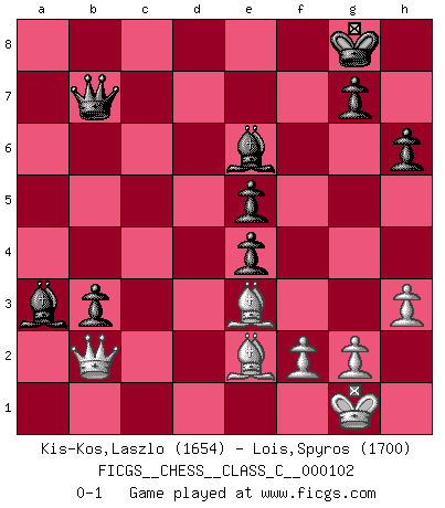 Last move : 0-1 2009 February 27 3:34:43 [Event "FICGS__CHESS__CLASS_C__000102"] [Site "FICGS"] [Date "2008.12.07"] [Round "1"] [White "Kis-Kos,Laszlo"] [Black "Lois,Spyros"] [Result "0-1"] [WhiteElo "1654"] [BlackElo "1700"] 1.e4 e5 2.Nf3 Nc6 3.Bb5 a6 4.Ba4 Nf6 5.O-O b5 6.Bb3 d6 7.Re1 Be7 8.c3 O-O 9.h3 Na5 10.Bc2 c5 11.d4 Qc7 12.d5 c4 13.b4 cxb3 14.axb3 Bd7 15.Nbd2 Qxc3 16.Ba3 Rfc8 17.Rc1 Nb7 18.Bd3 Qa5 19.Ra1 Qd8 20.b4 h6 21.Nb3 a5 22.bxa5 Nxa5 23.Nxa5 Rxa5 24.Bb4 Rxa1 25.Qxa1 Ra8 26.Qb2 Bf8 27.Ra1 Nh5 28.Bd2 Rxa1+ 29.Qxa1 Qc8 30.Kf1 f5 31.Be2 fxe4 32.Nxe5 dxe5 33.Bxh5 Qc4+ 34.Be2 Qxd5 35.Be3 b4 36.Kg1 b3 37.Qc3 Be6 38.Qc1 Qb7 39.Qb2 Ba3 0-1 Ruy Lopez : ...b5 & ...d6 Kingside Castling by player White (move 5) Kingside Castling by player Black (move 8) Player Black won this chess game. Follow this game move after move (download)Chess is the art which expresses the science of logic. (Mikhail Botvinnik) Korrekt heißt in Deutschland die Haltung eines Mannes, dessen Benehmen nach dem Urteile seiner Nachbarn seiner Stellung angemessen ist. Um korrekt zu sein, muß man sich der Meinung der anderen anpassen... (Emanuel Lasker) Cuando no sepas que mover, espera por una idea que se le venga a la la cabeza de tu oponente. Tenlo por seguro de que esa idea estará incorrecta. (Siegbert Tarrasch) La menace est plus forte que l'exécution. (Aaron Nimzovitch) Humor is by far the most significant activity of the human brain. (Edward De Bono)