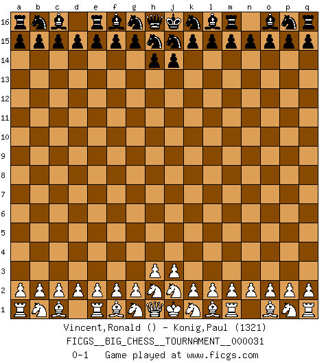 Last move : 0-1 2009 January 8 6:11:23 [Event "FICGS__BIG_CHESS__TOURNAMENT__000031"] [Site "FICGS"] [Date "2008.12.09"] [Round "1"] [White "Vincent,Ronald"] [Black "Konig,Paul"] [Result "0-1"] [WhiteElo ""] [BlackElo "1321"] 0-1 This big chess game has been lost on time (started : 2008.12.09 1:30:17) Follow this game move after move (download)I played Chess with him and would have beaten him sometimes only he always took back his last move, and ran the game out differently. (Mark Twain) Wie gewinnt Tal? Er entwickelt alle seine Figuren in die Brettmitte und opfert sie dann irgendwo. (Robert James Fischer) En el Ajedrez, tal como es jugado por los Maestros, practicamente la suerte es eliminada. (Emanuel Lasker) Ne tendez aucun piège pour le plaisir ! Ne jouez rien dans l'espoir que l'adversaire réagisse de façon stupide ! Prenez toujours pour acquis que l'adversaire va trouver le meilleur coup ! Ne jouez jamais de coup dans l'espoir que l'adversaire ne voie pas la menace ! Chacun de vos coups doit améliorer la position d'une façon ou d'une autre. Somewhere in the world there is an epigram for every dilemma. (Hendrik Willem van Loon)