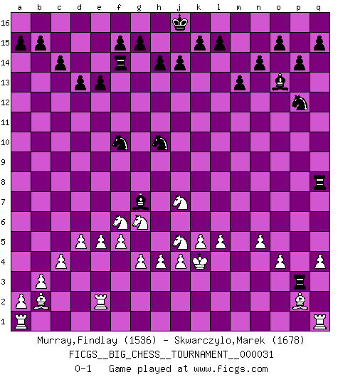 Last move : 0-1 2009 April 7 13:8:19 [Event "FICGS__BIG_CHESS__TOURNAMENT__000031"] [Site "FICGS"] [Date "2008.12.09"] [Round "1"] [White "Murray,Findlay"] [Black "Skwarczylo,Marek"] [Result "0-1"] [WhiteElo "1536"] [BlackElo "1678"] 1.j2-k4 j15-k13 2.h2-g4 e15-e13 3.p2-p3 d15-d13 4.o1-p2 c15-c14 5.o2-o4 h16-o10 6.c2-c4 c16-l8 7.k1-h2 f16-b12 8.g1-j2 b16-d15 9.b2-b3 b12-g7 10.b1-c3 p15-p14 11.c1-b2 o16-p15 12.e2-e3 e16-e14 13.d2-d4 m15-m13 14.f2-f4 l16-o13 15.m2-m4 m16-m14 16.n2-n4 p16-o14 17.f1-e2 q16-m16 18.p1-n2 m14-n14 19.n4-n5 a16-e16 20.l1-m2 m16-m14 21.j2-h4 e14-f14 22.g4-e5 l8-e2 23.e1-e2 o14-p12 24.g2-g4 h15-j13 25.c3-d5 g16-j15 26.l2-l4 k16-h15 27.h2-k3 d15-c13 28.k4-h5 g7-m2 29.m1-m2 f14-f12 30.n2-l3 e16-e14 31.j1-j2 e14-f14 32.l3-k5 j15-h13 33.e5-g6 f12-g12 34.f4-f5 h15-g13 35.k3-j5 h13-j11 36.k2-k4 j13-k11 37.e3-e4 m14-l14 38.l4-l5 k11-l9 39.k5-j7 j11-l10 40.j3-j4 k13-j11 41.j2-j3 l10-k8 42.k4-k5 j11-k9 43.e4-e5 g13-j12 44.d5-f6 j12-h10 45.h1-a8 c13-e12 46.a8-k8 k9-j7 47.h5-j7 p15-g7 48.h4-k3 n14-n8 49.k8-m6 g12-m12 50.m6-q6 o10-q8 51.q6-q8 n8-q8 52.m2-m3 n15-n14 53.q2-q4 e12-f10 54.d4-d5 l9-m7 55.h3-h4 m7-l5 56.k3-l5 l14-l5 57.m4-l5 m12-m3 58.j3-k4 m3-p3 0-1 Follow this game move after move (download)Chess is like life. (Boris Spassky) Ja, ich habe einmal eine Blitzpartie gespielt, es war in einem Zug, 1929. --im Interview 1989 (Mikhail Moiseyevich Botvinik) Si tu oponente te ofrece un empate, trata de averiguar porque piensa él que esta en una posición peor. (Nigel Short) J'ai toujours senti une vague pitié pour l'homme qui ne connaît rien aux échecs, tout comme j'en aurais pour un homme ignorant de l'amour. Les Echecs, comme la musique ou comme l'amour, ont le pouvoir de rendre heureux. (Siegbert Tarrasch) As a goal marker shodan is important. As a destination it is a poor place to stop. (Thomas Tamayo)