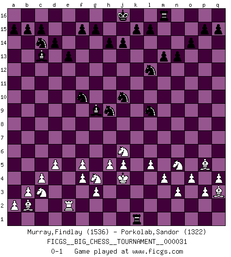 Last move : 0-1 2009 March 2 22:50:13 [Event "FICGS__BIG_CHESS__TOURNAMENT__000031"] [Site "FICGS"] [Date "2008.12.09"] [Round "1"] [White "Murray,Findlay"] [Black "Porkolab,Sandor"] [Result "0-1"] [WhiteElo "1536"] [BlackElo "1322"] 1.j2-k4 h15-g13 2.h2-g4 b16-c14 3.p2-p3 e15-e13 4.o1-p2 e16-e14 5.e2-e3 j15-k13 6.f1-b5 h16-k14 7.c2-c4 n15-n13 8.b2-b3 g16-j15 9.c1-b2 o15-o14 10.m2-m4 o16-g9 11.l1-p5 k16-h15 12.o2-o4 f16-c13 13.n2-n3 p16-n15 14.k1-h2 n15-l14 15.p1-o3 m15-m13 16.o3-n5 e14-d14 17.d2-d4 d14-d12 18.f2-f4 d12-l12 19.l2-l4 d15-d14 20.b1-c3 c16-h11 21.b5-h11 g13-h11 22.h3-h4 l16-o13 23.g4-j5 h15-j13 24.h2-g4 k14-q8 25.q2-q4 l14-k12 26.g1-h3 j15-h13 27.k2-k3 k13-j11 28.g2-g3 m16-m14 29.j1-j2 j13-k11 30.h3-g5 h13-g11 31.j3-j4 g11-h9 32.h1-d5 h11-f10 33.e3-e4 m14-k14 34.j2-h3 k12-j10 35.h4-h5 k11-l9 36.k4-j6 l12-k12 37.k3-k4 k12-d12 38.d5-e5 q8-q7 39.m1-m2 a16-e16 40.d4-d5 e16-e14 41.k4-k5 q16-m16 42.p2-q3 e14-g14 43.j5-h7 o13-h7 44.g5-h7 q7-h7 45.e5-f5 h7-f5 46.e4-f5 j11-l12 47.m2-e2 k14-k12 48.j4-j5 g14-g11 49.l4-l5 k12-k5 50.h3-j4 g11-k11 51.q1-k1 d12-k12 52.k1-k5 k11-k5 53.e1-k1 k5-k1 54.a1-k1 k12-k1 0-1 Follow this game move after move (download)It is difficult to play against Einstein's theory --on his first loss to Fischer. (Mikhail Tal) Die FIDE ist dabei in die Hände der russischen Mafia zu fallen. (Larry Evans) Los tropiezos estan todos ahí en el tablero, esperando que se cometan. (Savielly Tartakover) Les sacrifices démontrent seulement que quelqu'un a gaffé. (Savielly Tartacover) War is the child of passion, passion is the child of narcissism and narcissism is the child. (...) Another game ? (Thibault de Vassal)
