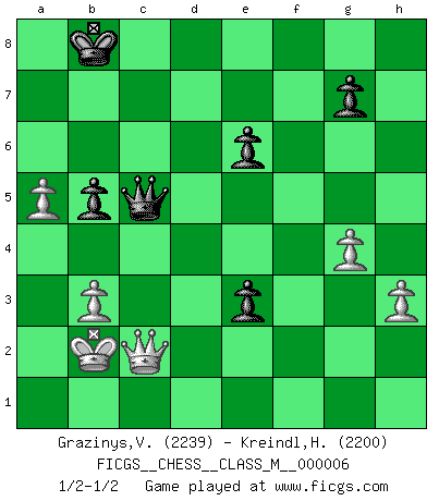 Last move : 1/2-1/2 2006 December 23 19:43:13 [Event "FICGS__CHESS__CLASS_M__000006"] [Site "FICGS"] [Date "2006.08.22"] [Round "1"] [White "Grazinys,Vidmantas"] [Black "Kreindl,Helmut"] [Result "1/2-1/2"] [WhiteElo "2239"] [BlackElo "2200"] 1.e4 d5 2.exd5 Qxd5 3.Nc3 Qd6 4.d4 Nf6 5.Nf3 c6 6.Bd3 Bg4 7.Be3 e6 8.h3 Bh5 9.Qe2 Nbd7 10.O-O-O Be7 11.g4 Bg6 12.Bxg6 hxg6 13.Bg5 Qc7 14.Kb1 O-O-O 15.Ne5 Nxe5 16.dxe5 Nd5 17.Nxd5 Rxd5 18.Rxd5 cxd5 19.Bxe7 Qxe7 20.c4 d4 21.f4 g5 22.Qe4 Rd8 23.f5 Kb8 24.Rd1 Qc5 25.b3 a6 26.Rd3 Rd7 27.Kb2 b5 28.cxb5 axb5 29.fxe6 fxe6 30.Qe2 Rd5 31.Qd2 Qc7 32.Qxg5 Rxe5 33.Qd2 Re4 34.a4 Qc5 35.Qc2 Qd5 36.a5 Re3 37.Rxe3 dxe3 38.Qe2 Qc5 39.Qc2 1/2-1/2 Scandinavian : Pytel-Wade variation Queenside Castling by player White (move 10) Queenside Castling by player Black (move 14) This chess game ended in a draw. Follow this game move after move (download)The older I grow, the more I value pawns. (Paul Keres) Ich spiele 70 Eröffnungssysteme. (Viktor Kortschnoi) Robert Fischer es la ley hacia si mismo. (Larry Evans) Botvinnik disait en comparant les échecs à la musique: Il existe une science dont le but est l'étude de l'acoustique et des sons. Mais il y a aussi un art qui se sert de l'océan des sons : c'est la musique. De toute évidence, il en est de même pour la pensée. La logique est l'étude des lois de la réflexion et les échecs reflètent, en tant qu'art, le côté logique de la réflexion, sous la forme d'images artistiques... Extrait de Fischer - Spassky, Reykjavik 1972 par Alexander & F. Wyndham (Ed. Solar), p 37. An expert is a man who has made all the mistakes which can be made in a very narrow field. (Niels Bohr)