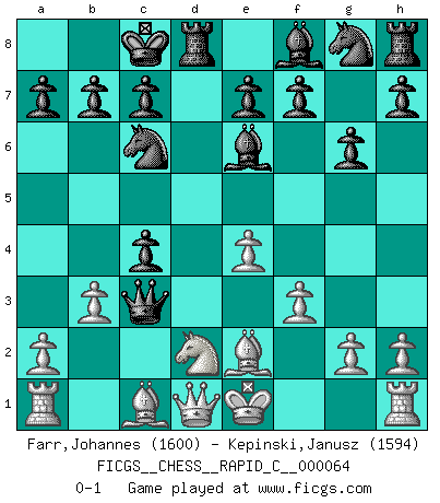 Last move : 0-1 2009 January 22 15:4:29 [Event "FICGS__CHESS__RAPID_C__000064"] [Site "FICGS"] [Date "2008.12.13"] [Round "1"] [White "Farr,Johannes"] [Black "Kepinski,Janusz"] [Result "0-1"] [WhiteElo "1600"] [BlackElo "1594"] 1.d4 d5 2.c4 Nc6 3.Nc3 dxc4 4.Nf3 Bg4 5.Nd2 Qxd4 6.f3 Be6 7.e4 O-O-O 8.Be2 g6 9.b3 Qxc3 0-1 QGD : Chigorin defense, Janowski variation Queenside Castling by player Black (move 7) Player Black won this chess game. Follow this game move after move (download)The blunders are all there on the board, waiting to be made. (Savielly Tartakover) Der zweitbeste Zug ist oft der einzig richtige. (Savielly Grigorievitsch Tartakower) El Ajedrez te enseña a controlarl la excitación inicial que sientes cuando vez algo que parece bueno y te enseña a pensar objetivamente cuando te encuentras en problemas. (Stanley Kubrick) La tactique est l'élément le plus important du milieu de jeu. (Siegbert Tarrasch) He who is a good ruler must first have been ruled. (Aristotle)
