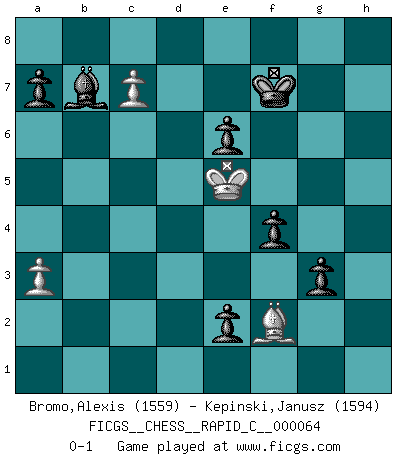Last move : 0-1 2009 February 20 21:38:50 [Event "FICGS__CHESS__RAPID_C__000064"] [Site "FICGS"] [Date "2008.12.13"] [Round "1"] [White "Bromo,Alexis"] [Black "Kepinski,Janusz"] [Result "0-1"] [WhiteElo "1559"] [BlackElo "1594"] 1.e4 e6 2.d4 d5 3.Nc3 Nf6 4.Bd3 c5 5.Nf3 Nc6 6.Be3 cxd4 7.Nxd4 Bb4 8.Qd2 O-O 9.O-O Nxe4 10.Bxe4 Bxc3 11.Qxc3 dxe4 12.Rfd1 Nxd4 13.Rxd4 Qf6 14.Re1 b6 15.Qd2 Bb7 16.c3 Rfd8 17.Rxd8+ Rxd8 18.Qc1 h6 19.Rd1 Rd3 20.Rxd3 exd3 21.Qd2 Qg6 22.g3 Qe4 23.f4 Qh1+ 24.Kf2 Qxh2+ 25.Ke1 Qxg3+ 26.Bf2 Qf3 27.Kf1 Ba6 28.b3 Qe2+ 29.Qxe2 dxe2+ 30.Ke1 Bd3 31.Kd2 Bb1 32.a3 Ba2 33.b4 Bc4 34.Ke3 f5 35.Kd4 Bd5 36.c4 Bf3 37.Ke5 Kf7 38.Kd6 g5 39.fxg5 hxg5 40.c5 bxc5 41.bxc5 f4 42.c6 g4 43.c7 Bb7 44.Ke5 g3 0-1 French : Swiss variation Kingside Castling by player Black (move 8) Kingside Castling by player White (move 9) Player Black won this chess game. Follow this game move after move (download)In blitz, the Knight is stronger than the Bishop. (Vlastimil Hort) Ich glaube nicht an Psychologie, ich glaube an gute Züge. (Robert James Fischer) No existe un remordimiento como el remordimiento del Ajedrez. (H. G. Wells) La solitude du joueur d'Echecs à l'approche du mat est semblable à celle du condamné. (Francis Szpiner) O divine art of subtlety and secrecy! Through you we learn to be invisible, through you inaudible and hence we can hold the enemy's fate in our hands. (Sun Tzu)