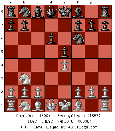 Last move : 0-1 2009 January 21 19:28:26 [Event "FICGS__CHESS__RAPID_C__000064"] [Site "FICGS"] [Date "2008.12.13"] [Round "1"] [White "Chen,Des"] [Black "Bromo,Alexis"] [Result "0-1"] [WhiteElo "1600"] [BlackElo "1559"] 1.e4 c5 2.Nf3 d6 3.d4 cxd4 4.Nxd4 e5 5.Nb3 Nf6 0-1 This chess game has been lost on time (started : 2008.12.13 2:58:24) Sicilian Player Black won this chess game. Follow this game move after move (download)The laws of Chess do not permit a free choice: you have to move whether you like it or not. (Emanuel Lasker) Taktik ist was man tun muß, wenn etwas zu tun ist. Strategie ist was man tun muß, wenn nichts zu tun ist. (Savielly Grigorievitsch Tartakower) ¿Cual es el objetivo de jugar una apertura de gambito?... Para adquirir una reputación de ser un jugador apuesto a costo de perder el juego. (Siegbert Tarrasch) Les sacrifices démontrent seulement que quelqu'un a gaffé. (Savielly Tartacover) Rules and bones are meant to be broken. (Anonymous)