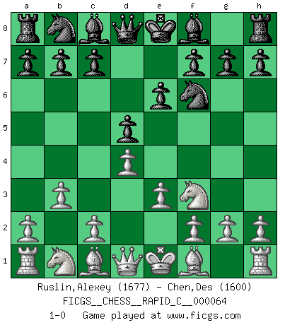 Last move : 1-0 2009 February 1 8:23:15 [Event "FICGS__CHESS__RAPID_C__000064"] [Site "FICGS"] [Date "2008.12.13"] [Round "1"] [White "Ruslin,Alexey"] [Black "Chen,Des"] [Result "1-0"] [WhiteElo "1677"] [BlackElo "1600"] 1.d4 Nf6 2.Nf3 e6 3.e3 d5 4.b3 1-0 This chess game has been lost on time (started : 2008.12.13 2:58:24) Queen's pawn : Yusupov-Rubinstein system Player White won this chess game. Follow this game move after move (download)I know people who have all the will in the world, but still can't play good Chess. (Bobby Fischer) Er war ein guter Schachspieler, aber ich kann Leute nicht ausstehen, die 'Heil Hitler' rufen (Über Alexander Aljechin). (Miguel Najdorf) Yo creo que el Ajedrez posee una magia que es también una ayuda en la edad avanzada. Una rodilla reumática es olvidada durante una partida de Ajedrez y otros eventos pueden parecer algo sin importancia comparada a una catástrofe en el tablero de Ajedrez. (Vlastimil Hort) Toutes choses étant égales, c'est la conviction qui gagne. Alliée à une volonté de vaincre, elle sert de détonateur, suscite des idées, disperse les doutes et aide à penser clairement. (Robert Fischer) Perseverance does not equal worthiness. Next time you want to get my attention, wear something fun. Low-riding jeans are hot. (Gregory House, House M.D.)