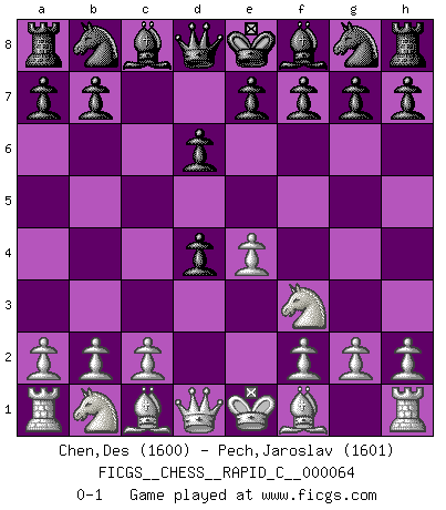 Last move : 0-1 2009 January 30 20:15:25 [Event "FICGS__CHESS__RAPID_C__000064"] [Site "FICGS"] [Date "2008.12.13"] [Round "1"] [White "Chen,Des"] [Black "Pech,Jaroslav"] [Result "0-1"] [WhiteElo "1600"] [BlackElo "1601"] 1.e4 c5 2.Nf3 d6 3.d4 cxd4 0-1 This chess game has been lost on time (started : 2008.12.13 2:58:24) Sicilian Player Black won this chess game. Follow this game move after move (download)In order to improve your game, you must study the endgame before everything else, for whereas the endings can be studied and mastered by themselves, the middle game and the opening must be studied in relation to the endgame. (Jose Raul Capablanca) Fischer: 'Remis!?' Uhlmann: 'Aber es muss doch dreimal Zugwiederholung sein!' Fischer: 'Sie nehmen das Remis an, wie ich es sage, sonst spiele ich weiter und werde Sie dann schlagen!' (Robert James Fischer) Aunque la mayoría de la gente disfruta observar las partidas de los grandes Maestros de ataque, algunos de los jugadores mas notables en la historia han sido los jugadores silenciosos posicionales. Lentamente ellos te aplastan despojandote de tu espacio, congestionando tus piezas y dejandote virtualmente sin nada que hacer. (Yasser Seirawan) Mais l'homme est une créature légère et illogique : semblable au joueur d'échecs, il n'aime que le processus du but à atteindre, non le but lui-même. (Dostoïevsky) It is not true that people stop pursuing dreams because they grow old, they grow old because they stop pursuing dreams. (Gabriel Garcia Marquez)
