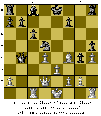 Last move : 0-1 2008 December 31 3:44:1 [Event "FICGS__CHESS__RAPID_C__000064"] [Site "FICGS"] [Date "2008.12.13"] [Round "1"] [White "Farr,Johannes"] [Black "Yague,Omar"] [Result "0-1"] [WhiteElo "1600"] [BlackElo "1568"] 1.d4 Nf6 2.c4 e6 3.Nc3 d5 4.cxd5 exd5 5.Bg5 Bb4 6.e3 h6 7.Bh4 g5 8.Bg3 Bxc3+ 9.bxc3 h5 10.h4 Ne4 11.Ne2 g4 12.Bf4 Nc6 13.Rc1 Ne7 14.c4 c6 15.cxd5 Qa5+ 16.Nc3 Nxc3 17.Qd2 Nexd5 18.Bc4 Qb4 19.Bxd5 Nxd5 0-1 Queen's pawn game Player Black won this chess game. Follow this game move after move (download)I play correspondence chess because it is both art and science while chess is art only. (A player at FICGS) Auf jeden Fall musst du zuerst Rechtsanwalt werden, damit du deine eigenen Interessen und die deiner Familie vertreten kannst. [Brief an seinen Sohn] (José Raúl Capablanca) El Ajedrez es imaginación. (David Bronstein) Un millionnaire : 'Monsieur Steinitz ! Vous ne participez aux tournois que pour l'argent, alors que moi je n'y viens que pour l'honneur.' Steinitz : 'Chacun joue pour ce qu'il n'a pas'... Fear is the path to the dark side. Fear leads to anger; anger leads to hate; hate leads to suffering. I sense much fear in you. (Master Yoda in Star Wars ep.1)