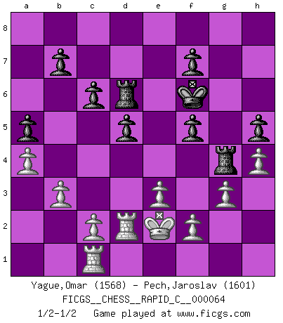 Last move : 1/2-1/2 2009 April 14 1:53:0 [Event "FICGS__CHESS__RAPID_C__000064"] [Site "FICGS"] [Date "2008.12.13"] [Round "1"] [White "Yague,Omar"] [Black "Pech,Jaroslav"] [Result "1/2-1/2"] [WhiteElo "1568"] [BlackElo "1601"] 1.Nf3 d5 2.d4 Nf6 3.Nc3 g6 4.e3 Bg7 5.Be2 Nc6 6.O-O O-O 7.b3 Re8 8.Ba3 e5 9.dxe5 Nxe5 10.Nxe5 Rxe5 11.Qd2 Bf5 12.Rad1 c6 13.Rfe1 Qa5 14.Bb2 Rae8 15.Bd3 R5e6 16.Bxf5 gxf5 17.Rf1 Nd7 18.Ba1 Nc5 19.Ne2 Qxd2 20.Rxd2 Ne4 21.Rd3 Nc5 22.R3d1 Bxa1 23.Rxa1 Kg7 24.Nd4 Rf6 25.g3 Ne4 26.Kg2 h5 27.h4 Nc3 28.a4 a5 29.Kf3 Re4 30.Rfe1 Rg4 31.Rac1 Kg6 32.Ne2 Nxe2 33.Rxe2 Rd6 34.Rd2 Kf6 35.Ke2 1/2-1/2 Reti Opening Kingside Castling by player White (move 6) Kingside Castling by player Black (move 6) This chess game ended in a draw. Follow this game move after move (download)Chess is played with the mind and not with the hands ! (Renaud and Kahn) Das Blackmar-Diemer-Gambit verändert den ganzen Menschen! (Emil Joseph Diemer) Cualquier cambio de material en una posición debe venir por medio de un mate, una captura o promoción de Peón. (Purdy) Demandez au pauvre Cg1 ce qu'il en pense. Eduard Gufeld à propos de la variante Saemisch de l'Est-Indienne. Life is painting a picture, not doing a sum. (Oliver Wendell Holmes, Jr.)