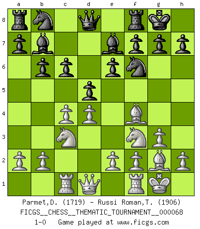 Last move : 1-0 2009 January 28 18:0:48 [Event "FICGS__CHESS__THEMATIC_TOURNAMENT__000068"] [Site "FICGS"] [Date "2008.12.13"] [Round "1"] [White "Parmet,Daniel"] [Black "Russi Roman,Tano-Urayoan"] [Result "1-0"] [WhiteElo "1719"] [BlackElo "1906"] 1.d4 Nf6 2.c4 e6 3.g3 d5 4.Nf3 Be7 5.Bg2 O-O 6.O-O c6 7.Nc3 b6 8.Bf4 Bb7 9.Rc1 1-0 This chess game has been lost on time (started : 2008.12.13 11:23:41) Catalan Opening Kingside Castling by player Black (move 5) Kingside Castling by player White (move 6) Player White won this chess game. Follow this game move after move (download)Bobby Fischer is the greatest Chess player who has ever lived. (Ken Smith) Ich habe Putins Aufstieg an die Macht beobachtet und seine Politik, die demokratischen Institutionen meines Landes zu zerstören. (Garry Kasparov) De eso se trata el Ajedrez. Un día le das una lección a tu oponente y al día siguiente el te da una a tí. (Bobby Fischer) Les Echecs ont trois composantes : le temps, l'espace et le matériel en dernier. (Mikhail Tal) I've never seen so many men wasted so badly. (Blondie in The Good, The Bad and The Ugly)