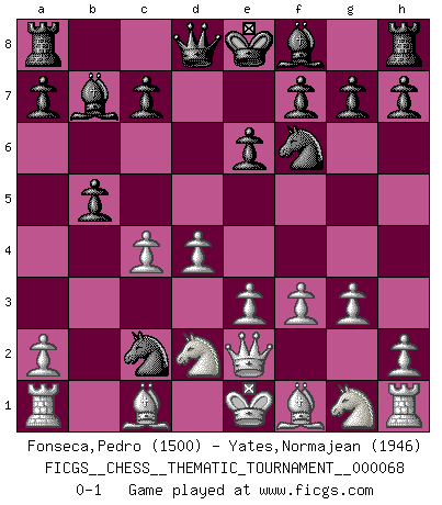 Last move : 0-1 2009 February 7 20:46:52 [Event "FICGS__CHESS__THEMATIC_TOURNAMENT__000068"] [Site "FICGS"] [Date "2008.12.13"] [Round "1"] [White "Fonseca,Pedro"] [Black "Yates,Normajean"] [Result "0-1"] [WhiteElo "1500"] [BlackElo "1946"] 1.d4 Nf6 2.c4 e6 3.g3 d5 4.Nd2 dxc4 5.e3 b5 6.Qe2 Bb7 7.f3 Na6 8.b3 Nb4 9.bxc4 Nc2+ 0-1 This chess game has been lost on time (started : 2008.12.13 11:23:41) Catalan Opening Player Black won this chess game. Follow this game move after move (download)The tactician must know what to do whenever something needs doing; the strategist must know what to do when nothing needs doing. (Savielly Tartakover) Je älter ich werde, um so mehr schätze ich die Bauern. (Paul Keres) Una buena memoria, concentración, imaginación y una fuerte voluntad, se requiere para llegar a ser un buen jugador. (Bobby Fischer) Les sacrifices démontrent seulement que quelqu'un a gaffé. (Savielly Tartacover) Life is like internet, nothing interesting, but noone want to leave it. (Ilmars Cirulis)
