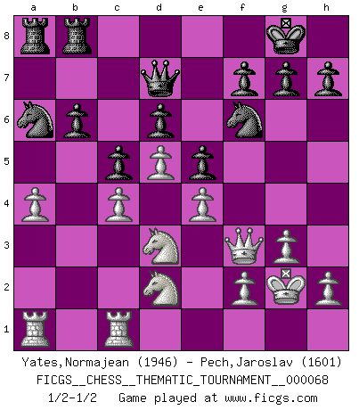 Last move : 1/2-1/2 2009 April 14 1:54:25 [Event "FICGS__CHESS__THEMATIC_TOURNAMENT__000068"] [Site "FICGS"] [Date "2008.12.13"] [Round "1"] [White "Yates,Normajean"] [Black "Pech,Jaroslav"] [Result "1/2-1/2"] [WhiteElo "1946"] [BlackElo "1601"] 1.d4 Nf6 2.c4 e6 3.g3 Bb4+ 4.Bd2 Qe7 5.Nf3 Nc6 6.Bg2 Bxd2+ 7.Nbxd2 d6 8.O-O a5 9.e4 e5 10.d5 Nb8 11.Ne1 O-O 12.Nd3 Na6 13.a3 Bg4 14.Bf3 Bxf3 15.Qxf3 a4 16.b4 axb3 17.Nxb3 Qd7 18.Rfc1 c5 19.a4 Rfb8 20.Kg2 b6 21.Nd2 1/2-1/2 Catalan Opening Kingside Castling by player White (move 8) Kingside Castling by player Black (move 11) This chess game ended in a draw. Follow this game move after move (download)As one by one I mowed them down, my superiority soon became apparent. (Jose Capablanca) Wir irren allesamt, nur jeder irrt anders. (Georg Christoph Lichtenberg) Prefiero perder una partida realmente buena, que ganar una mala. (David Levy) Vous savez, camarade Pachman, je n'éprouve pas de plaisir à être ministre, je jouerais plutôt aux échecs comme vous, ou alors ferais une révolution au Venezuela. (Che Guevara à Ludek Pachman, 'Checkmate in Prague', 1975) Everybody lies. (Gregory House, House M.D.)