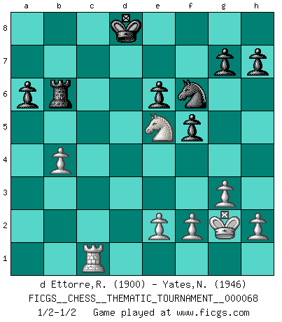 Last move : 1/2-1/2 2009 April 5 11:58:36 [Event "FICGS__CHESS__THEMATIC_TOURNAMENT__000068"] [Site "FICGS"] [Date "2008.12.13"] [Round "1"] [White "d Ettorre,Rodolfo"] [Black "Yates,Normajean"] [Result "1/2-1/2"] [WhiteElo "1900"] [BlackElo "1946"] 1.d4 Nf6 2.c4 e6 3.g3 d5 4.Bg2 dxc4 5.Qa4+ Nbd7 6.Qxc4 c5 7.Nf3 a6 8.Qc2 b6 9.Nc3 Bb7 10.Be3 Rc8 11.O-O b5 12.Qd2 Nb6 13.dxc5 Bxc5 14.Bxc5 Rxc5 15.Qxd8+ Kxd8 16.Ne1 Bxg2 17.Kxg2 Rc4 18.Nd3 Ke7 19.a4 b4 20.a5 Nbd5 21.Na4 Rc2 22.Rfe1 Ne4 23.Nb6 Rb8 24.Rec1 Rxc1 25.Rxc1 Nxb6 26.Nxb4 Kd7 27.axb6 Rxb6 28.Nd3 f5 29.Ne5+ Kd8 30.b4 Nf6 1/2-1/2 Catalan : Open, 5.Qa4 Nbd7, 6.Qxc4 Kingside Castling by player White (move 11) This chess game ended in a draw. Follow this game move after move (download)It's always better to sacrifice your opponent's men. (Savielly Tartakover) Später, ... hatte ich zunehmend Erfolg in entscheidenden Partien. Vielleicht weil ich eine einfache Wahrheit erkannte: nicht nur ich hatte Angst, auch mein Gegner. (Mikhail Nekhemyevich Tal) En el Ajedrez, tal como en la vida, las bendiciones de hoy pueden ser el veneno del mañana. (Assaic) Des combinaisons [dans le jeu d'échecs] pareilles à des mélodies. Je crois entendre pour ainsi dire la musique des coups... (Vladimir Nabokov) History is a gallery of pictures in which there are few originals and many copies. (Alexis de Tocqueville)