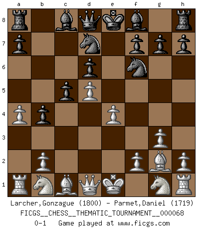 Last move : 0-1 2009 February 2 20:26:16 [Event "FICGS__CHESS__THEMATIC_TOURNAMENT__000068"] [Site "FICGS"] [Date "2008.12.13"] [Round "1"] [White "Larcher,Gonzague"] [Black "Parmet,Daniel"] [Result "0-1"] [WhiteElo "1800"] [BlackElo "1719"] 1.d4 Nf6 2.c4 e6 3.g3 c5 4.d5 exd5 5.cxd5 b5 6.Bg2 d6 7.a4 b4 8.e4 Nbd7 0-1 This chess game has been lost on time (started : 2008.12.13 11:23:41) Catalan Opening Player Black won this chess game. Follow this game move after move (download)When you are lonely, when you feel yourself an alien in the world, play Chess. This will raise your spirits and be your counselor in war. (Aristotle) Wie bekannt hörte Morphy 1859 auf, Schach zu spielen. Seine Enttäuschung galt nicht so sehr dem Schach, wie den Schachspielern. (Robert James Fischer) Debemos de asegurarnos de que el Ajedrez no se convierta en un lenguaje muerto, muy interesante, pero tan solo para un grupo muy pequeño. (Sytze Faber) Les erreurs sont comme les malheurs, elles n'arrivent jamais seules. (Siegbert Tarrasch) They misunderestimated me. (George W. Bush, Bentonville nov. 6, 2000)