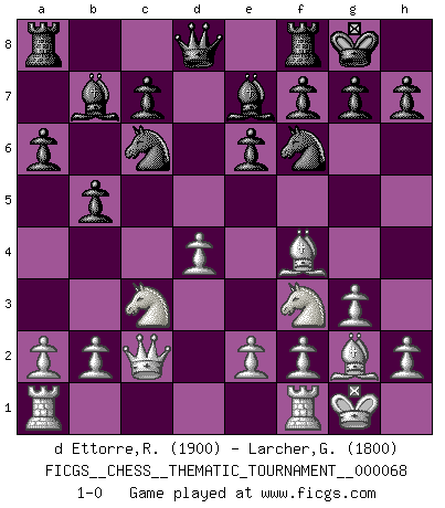 Last move : 1-0 2009 March 15 22:53:7 [Event "FICGS__CHESS__THEMATIC_TOURNAMENT__000068"] [Site "FICGS"] [Date "2008.12.13"] [Round "1"] [White "d Ettorre,Rodolfo"] [Black "Larcher,Gonzague"] [Result "1-0"] [WhiteElo "1900"] [BlackElo "1800"] 1.d4 Nf6 2.c4 e6 3.g3 d5 4.Bg2 Be7 5.Nf3 O-O 6.O-O dxc4 7.Qc2 a6 8.Qxc4 b5 9.Qc2 Bb7 10.Bf4 Nc6 11.Nc3 1-0 This chess game has been lost on time (started : 2008.12.13 11:23:41) Catalan : Closed, 5.Nf3 Kingside Castling by player Black (move 5) Kingside Castling by player White (move 6) Player White won this chess game. Follow this game move after move (download)My God, Bobby Fischer plays so simply. (Alexei Suetin) Auf jeden Fall musst du zuerst Rechtsanwalt werden, damit du deine eigenen Interessen und die deiner Familie vertreten kannst. [Brief an seinen Sohn] (José Raúl Capablanca) Fischer es el jugador mas fuerte del mundo. De hecho, el jugador mas fuerte que jamas haya existido. (Larry Evans) Le profane ne songe pas à la somme de jouissance dont il se prive, qui méconnaît ce jeu aux ressources aussi variées que passionnantes. (Jean-Marie Jeanton-Lamarche) No enterprise is more likely to succeed than one concealed from the enemy until it is ripe for execution. (Niccolo Machiavelli)