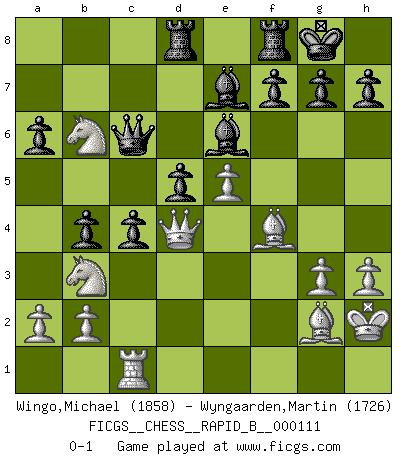 Last move : 0-1 2009 February 18 14:53:12 [Event "FICGS__CHESS__RAPID_B__000111"] [Site "FICGS"] [Date "2008.12.13"] [Round "1"] [White "Wingo,Michael"] [Black "Wyngaarden,Martin"] [Result "0-1"] [WhiteElo "1858"] [BlackElo "1726"] 1.d4 Nf6 2.c4 e6 3.g3 d5 4.Nf3 dxc4 5.Bg2 a6 6.O-O Nc6 7.Nc3 Rb8 8.e4 Be7 9.Qe2 b5 10.Rd1 Nb4 11.d5 exd5 12.e5 Ng4 13.h3 Nxf2 14.Qxf2 Nd3 15.Rxd3 cxd3 16.Be3 O-O 17.Rd1 c6 18.Rxd3 Bf5 19.Rd1 Qd7 20.Kh2 Rbc8 21.Nd4 Be6 22.Nb3 Qc7 23.Bf4 b4 24.Na4 c5 25.Rc1 c4 26.Nb6 Rcd8 27.Qd4 Qc6 0-1 Catalan Opening Kingside Castling by player White (move 6) Kingside Castling by player Black (move 16) Player Black won this chess game. Follow this game move after move (download)The game of Chess is not merely an idle amusement; several very valuable qualities of the mind are to be acquired and strengthened by it, so as to become habits ready on all occasions; for life is a kind of Chess. (Benjamin Franklin) Dass jemand wie Surab Asmaiparaschwili, der selbst Elopunkte gekauft hat , Vize-Präsident der Fide werden konnte, sagt schon einges über den Zustand dieser Organisation aus. (Joel Lautier) Una buena memoria, concentración, imaginación y una fuerte voluntad, se requiere para llegar a ser un buen jugador. (Bobby Fischer) Le système Elo représente seulement une moyenne. Il est simplement un indicateur de votre stabilité. (Anatoli Karpov) I can't decide which is riskier; taking crazy risks, or taking advice on crazy risks from a crazy risk taker. (Gregory House in House M.D.)