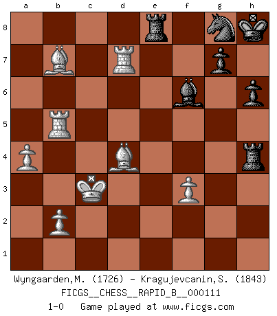 Last move : 1-0 2009 February 25 23:18:2 [Event "FICGS__CHESS__RAPID_B__000111"] [Site "FICGS"] [Date "2008.12.13"] [Round "1"] [White "Wyngaarden,Martin"] [Black "Kragujevcanin,Stole"] [Result "1-0"] [WhiteElo "1726"] [BlackElo "1843"] 1.e4 c5 2.Nf3 d6 3.d4 cxd4 4.Nxd4 Nf6 5.Nc3 a6 6.Be3 e5 7.Nb3 Be6 8.f3 Be7 9.Qd2 O-O 10.O-O-O Nbd7 11.g4 b5 12.g5 Nh5 13.Kb1 Nb6 14.Nd5 Bxd5 15.exd5 Qc7 16.Na5 Nxd5 17.Qxd5 Qxa5 18.Bd3 Rac8 19.Be4 Qc7 20.Qb7 Kh8 21.c3 Qxb7 22.Bxb7 Rb8 23.Bxa6 f6 24.Rd5 b4 25.cxb4 Rxb4 26.Rb5 Ra4 27.gxf6 Nxf6 28.Bb7 Rh4 29.Bf2 Rf4 30.Rc1 h6 31.Rc7 Ng8 32.Be1 Bg5 33.Bb4 Rd4 34.Kc2 Bd8 35.Rd7 Rh4 36.Bxd6 Rxh2+ 37.Kc3 Re8 38.a4 Rh4 39.Bxe5 Bf6 40.Bd4 1-0 Sicilian : Najdorf, Byrne (English) attack Kingside Castling by player Black (move 9) Queenside Castling by player White (move 10) Player White won this chess game. Follow this game move after move (download)A great player and a great example for many. His book My 60 Memorable Games had a big impact on me. It is a shame he didn't continue to enrich the world of chess with his unparalleled understanding after 1972. (Jan Timman, about Bobby Fischer's death) Es tut gut, die Entwicklungsperiode von, [...] demokratischem Geist durchdringen zu lassen. Wie undemokratisch wäre es doch beispielsweise, den einen Offizier große Spaziertouren vornehmen zu lassen, während die anderen zu Hause säßen und sich entsetzlich langweilten. (Aaron Nimzowitsch) Si el Ajedrez es una ciencia, es la mas inexacta. Si el Ajedrez es un arte, es demasiado inexacto para ser visto como tal. Si el Ajedrez es un deporte, es demasiado esotérico. Si el Ajedrez es un juego, es demasiado exigente para ser solo un juego. Si el Ajedrez es una aventura, es una muy demandante. Si el Ajedrez es una pasión, es una muy gratificante. Si el Ajedrez es la vida, es una muy triste. (Anónimo) Les échecs, c'est l'imagination. (David Bronstein) The problem with troubleshooting is that trouble shoots back. (Anonymous)