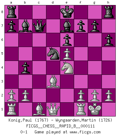 Last move : 0-1 2009 February 1 20:23:42 [Event "FICGS__CHESS__RAPID_B__000111"] [Site "FICGS"] [Date "2008.12.13"] [Round "1"] [White "Konig,Paul"] [Black "Wyngaarden,Martin"] [Result "0-1"] [WhiteElo "1767"] [BlackElo "1726"] 1.d4 d5 2.c4 c6 3.e3 Nf6 4.Nc3 e6 5.Nf3 Nbd7 6.Bd3 dxc4 7.Bxc4 b5 8.Bd3 Bb7 9.e4 b4 10.Na4 c5 11.e5 Nd5 12.Nxc5 Nxc5 13.dxc5 Bxc5 14.O-O h6 15.Nd2 Qc7 16.Ne4 Be7 0-1 This chess game has been lost on time (started : 2008.12.13 22:29:4) QGD Slav defense Kingside Castling by player White (move 14) Player Black won this chess game. Follow this game move after move (download)Chess is war over the board. The object is to crush the opponents mind. (Bobby Fischer) Wer mein Gambit spielt, muß bereit sein, alle Brücken hinter sich abzubrechen. Es verändert den ganzen Menschen. Es wirkt wie ein Zauberstab und fördert verkümmerte, gute Charakter- eigenschaften wieder zu Tage. (Emil Joseph Diemer) Cualquier cambio de material en una posición debe venir por medio de un mate, una captura o promoción de Peón. (Purdy) Je crois qu'il existe des manières très spécifiques de jouer efficacement contre une machine. Evidemment, nous n'avons aucune chance en technique pure, parce que l'ordinateur calcule de manière parfaite. Mais lorsque nous faisons appel à notre cerveau, en utilisant l'intuition et la compréhension, alors nous restons beaucoup plus forts. (Anatoli Karpov) Question: Is 'This statement is paradoxical' a paradoxical statement ? Or is it a meta-paradox ? (Normajean Yates)