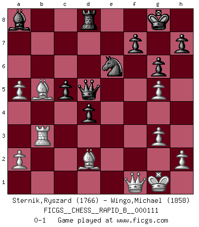 Last move : 0-1 2009 February 28 1:28:19 [Event "FICGS__CHESS__RAPID_B__000111"] [Site "FICGS"] [Date "2008.12.13"] [Round "1"] [White "Sternik,Ryszard"] [Black "Wingo,Michael"] [Result "0-1"] [WhiteElo "1766"] [BlackElo "1858"] 1.e4 e5 2.Nf3 Nc6 3.d4 exd4 4.Nxd4 Nf6 5.Nxc6 bxc6 6.e5 Qe7 7.Qe2 Nd5 8.c4 Nb6 9.Nc3 Qe6 10.Qe4 g6 11.Bd2 Bg7 12.f4 d5 13.cxd5 cxd5 14.Qc2 c6 15.Ne2 Qe7 16.Nd4 Bd7 17.Ba6 c5 18.Nf3 O-O 19.O-O Rab8 20.Be3 d4 21.Bd2 Nd5 22.Rac1 Bc8 23.Bd3 Bh6 24.g3 Bh3 25.Rfe1 Rfc8 26.b3 Qd8 27.Ba6 Rc6 28.Bc4 Be6 29.Qe4 R6c8 30.Red1 Qd7 31.Ng5 Bxg5 32.fxg5 Nc7 33.Be2 Bd5 34.Qf4 Ne6 35.Qf1 a5 36.Bc4 a4 37.bxa4 Rb2 38.Ba6 Rd8 39.Bb5 Qc7 40.a5 Ba8 41.Rb1 Rxb1 42.Rxb1 Qxe5 43.Rb3 Qd5 0-1 Scotch : Mieses variation Kingside Castling by player Black (move 18) Kingside Castling by player White (move 19) Player Black won this chess game. Follow this game move after move (download)No one ever won a game by resigning. (Unknown) Garry Kasparov war erst in der Großmeister-Organisation GMA, dann in der Profischach-Vereinigung PCA, zum Schluss kehrte er wieder in den Schoß der FIDE zurück. Aber gut, manche Leute sind flexibel (Viswanathan Anand) Las ideas audaces son como las piezas del Ajedrez que avanzan hacia adelante. Ellas pueden ser vencidas, pero también pueden iniciar una partida victoriosa. (Goethe) Les Echecs ne sont pas pour les âmes timides. Ils requièrent un homme entier, qui ne s'arrête pas aveuglément à ce qui a été déjà établi, mais qui tente individuellement de sonder les profondeurs du jeu. (W. Steinitz) Shallow men believe in luck. Strong men belive in cause and effect. (Ralph Waldo Emerson)