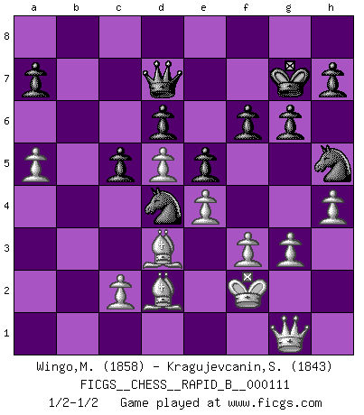 Last move : 1/2-1/2 2009 March 12 4:58:50 [Event "FICGS__CHESS__RAPID_B__000111"] [Site "FICGS"] [Date "2008.12.13"] [Round "1"] [White "Wingo,Michael"] [Black "Kragujevcanin,Stole"] [Result "1/2-1/2"] [WhiteElo "1858"] [BlackElo "1843"] 1.d4 g6 2.e4 Bg7 3.Nc3 c5 4.dxc5 Bxc3+ 5.bxc3 Qa5 6.Qd4 Nf6 7.Qb4 Qc7 8.Nf3 Nc6 9.Qc4 b6 10.Bd3 Na5 11.Qd4 bxc5 12.Qe3 Bb7 13.c4 O-O 14.O-O d6 15.h3 Nd7 16.Bb2 e5 17.Qh6 f6 18.Bc3 Ba6 19.Nd2 Nc6 20.a4 Nd4 21.Rfb1 Rab8 22.a5 Rxb1+ 23.Rxb1 Rb8 24.Rxb8+ Qxb8 25.f3 Nf8 26.Kf2 Nfe6 27.Nf1 Bb7 28.Ne3 Qd8 29.h4 Nf4 30.g3 Nh5 31.Nd5 Bxd5 32.cxd5 Qc8 33.Qc1 Qh3 34.Qg1 Kg7 35.Bd2 Qd7 1/2-1/2 Modern defense Kingside Castling by player Black (move 13) Kingside Castling by player White (move 14) This chess game ended in a draw. Follow this game move after move (download)The passion for playing Chess is one of the most unaccountable in the world. (H.G. Wells) Ja, jede Frau in Holland liebt mich bestimmt, und alle Männer hassen mich. (Loek van Wely) Puntos débiles o agujeros en la posición de tu oponente deben de ser ocupados por piezas, no Peones. (Siegbert Tarrasch) La conception d'un plan est le processus par lequel un joueur exploite les avantages de sa position tout en s'efforçant d'en réduire au minimum les inconvénients. Afin de garantir le succès, un plan doit toujours se fonder sur un diagnostic objectif des particularités d'une position. La conception d'un plan est d'autant plus difficile que la position est équilibrée, et grandement facilitée lorsqu'il n'existe qu'un seul plan susceptible de répondre aux exigences de la position. (Harry Golombek) Don't anthropomorphize computers - they hate it. (Anonymous)