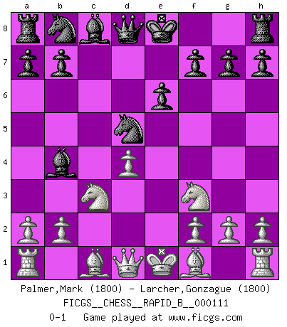 Last move : 0-1 2009 February 11 9:0:44 [Event "FICGS__CHESS__RAPID_B__000111"] [Site "FICGS"] [Date "2008.12.13"] [Round "1"] [White "Palmer,Mark"] [Black "Larcher,Gonzague"] [Result "0-1"] [WhiteElo "1800"] [BlackElo "1800"] 1.e4 c6 2.d4 d5 3.exd5 cxd5 4.c4 Nf6 5.cxd5 Nxd5 6.Nc3 e6 7.Nf3 Bb4 0-1 This chess game has been lost on time (started : 2008.12.13 22:29:4) Caro-Kann : Panov-Botvinnik attack Player Black won this chess game. Follow this game move after move (download)I'm not a materialistic person, in that, I don't suffer the lack or loss of money. The absence of worldly goods I don't look back on. For Chess is a way I can be as materialistic as I want without having to sell my soul. (Jamie Walter Adams) Kein Großmeister ist normal. Sie unterscheiden sich nur im Ausmaß Ihrer Verrücktheit. (Viktor Kortschnoi) No volvere nunca a jugar contigo. Has insultado a mi amigo. - cuando un oponente se maldijo por una mala jugada (Miguel Najdorf) Les écrivains ont utilisé les échecs pour analyser les côtés extrêmes de la nature humaine. Dans ce cadre, les échecs offrent un champ d'expérimentation idéal. Mais on pourrait faire la même chose avec la peinture. Et là, en vous référant à Van Gogh, vous ne tirerez pas de conclusion définitive sur les peintres. (Gary Kasparov) As a goal marker shodan is important. As a destination it is a poor place to stop. (Thomas Tamayo)