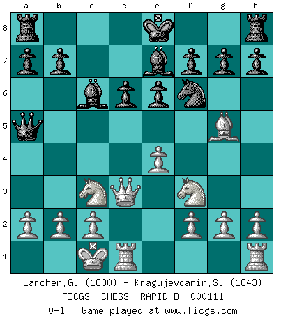 Last move : 0-1 2009 February 8 8:47:37 [Event "FICGS__CHESS__RAPID_B__000111"] [Site "FICGS"] [Date "2008.12.13"] [Round "1"] [White "Larcher,Gonzague"] [Black "Kragujevcanin,Stole"] [Result "0-1"] [WhiteElo "1800"] [BlackElo "1843"] 1.e4 c5 2.Nf3 d6 3.d4 cxd4 4.Qxd4 Nc6 5.Bb5 Bd7 6.Bxc6 Bxc6 7.Nc3 Nf6 8.Bg5 e6 9.O-O-O Be7 10.Qd3 Qa5 0-1 This chess game has been lost on time (started : 2008.12.13 22:29:4) Sicilian, Chekhover variation Queenside Castling by player White (move 9) Player Black won this chess game. Follow this game move after move (download)I feel as if I were a piece in a game of Chess, when my opponent says of it: That piece cannot be moved. (Soren Kierkegaard) Schach ist das schnellste Spiel der Welt, weil man in jeder Sekunde Tausende von Gedanken ordnen muß. (Albert Einstein) Muchos se han convertido en Maestros de Ajedrez, nadie se ha convertido en el Maestro del Ajedrez. (Siegbert Tarrasch) Assurément je connaissais par expérience le mystérieux attrait de ce jeu royal, le seul entre tous les jeux inventés par les hommes qui échappe souverainement à la tyrannie du hasard, le seul où l'on ne doive sa victoire qu'à son intelligence ou plutôt à une certaine forme d'intelligence. Mais n'est-ce pas déjà le limiter injurieusement que d'appeler les échecs un jeu ? N'est-ce pas une science, un art ou quelque chose qui, comme le cercueil de Mahomet entre ciel et terre, est suspendu entre l'un et l'autre, et qui réunit un nombre incroyable de contraires ? [...] C'est une pensée qui ne mène à rien, une mathématique qui n'établit rien, un art qui ne laisse pas d'uvre, une architecture sans matière; et il l'a prouvé néanmoins qu'il était plus durable, à sa manière, que les livres ou que tout autre monument, ce jeu unique qui appartient à tous les peuples et à tous les temps, et dont personne ne sait quel dieu en fit don à la terre pour tuer l'ennui, pour aiguiser l'esprit et stimuler l'âme. Où commence-t-il, où finit-il ? (Stefan Zweig) Information on the Internet is subject to the same rules and regulations as conversation at a bar. (George Lundberg)