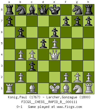 Last move : 0-1 2009 February 17 3:13:36 [Event "FICGS__CHESS__RAPID_B__000111"] [Site "FICGS"] [Date "2008.12.13"] [Round "1"] [White "Konig,Paul"] [Black "Larcher,Gonzague"] [Result "0-1"] [WhiteElo "1767"] [BlackElo "1800"] 1.d4 Nf6 2.c4 e6 3.Nc3 Bb4 4.Qc2 b6 5.e4 c5 6.a3 cxd4 7.axb4 dxc3 8.e5 Ng8 9.Qe4 d5 0-1 Nimzo-Indian : Classical variation Player Black won this chess game. Follow this game move after move (download)A thorough understanding of the typical mating continuations makes the most complicated sacrificial combinations leading up to them not only not difficult, but almost a matter of course. (Siegbert Tarrasch) Ein Großmeister muß tausende Partien in seinem Kopf speichern, denn diese sind für Ihn, was die Worte der Muttersprache für gewöhnliche Leute sind, oder Noten für Musiker... (Garry Kasparov) Si el Ajedrez es una ciencia, es la mas inexacta. Si el Ajedrez es un arte, es demasiado inexacto para ser visto como tal. Si el Ajedrez es un deporte, es demasiado esotérico. Si el Ajedrez es un juego, es demasiado exigente para ser solo un juego. Si el Ajedrez es una aventura, es una muy demandante. Si el Ajedrez es una pasión, es una muy gratificante. Si el Ajedrez es la vida, es una muy triste. (Anónimo) Donnez-moi un Cavalier en 6e et je gagnerais toutes mes parties. (Steinitz) A generalist learns less and less about more and more until he knows nothing about everything. (Author unknown)