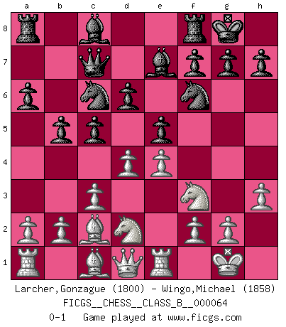 Last move : 0-1 2009 March 20 23:26:23 [Event "FICGS__CHESS__CLASS_B__000064"] [Site "FICGS"] [Date "2008.12.16"] [Round "1"] [White "Larcher,Gonzague"] [Black "Wingo,Michael"] [Result "0-1"] [WhiteElo "1800"] [BlackElo "1858"] 1.e4 e5 2.Nf3 Nc6 3.Bb5 a6 4.Ba4 Nf6 5.O-O Be7 6.Re1 b5 7.Bb3 d6 8.c3 O-O 9.h3 Na5 10.Bc2 c5 11.d4 Qc7 12.Nbd2 Nc6 0-1 This chess game has been lost on time (started : 2008.12.16 14:8:2) Ruy Lopez : Closed Kingside Castling by player White (move 5) Kingside Castling by player Black (move 8) Player Black won this chess game. Follow this game move after move (download)Chess is 99 percent tactics. (Teichmann) Kostenjuk hat keinen Sexappeal. (Loek van Wely) Bobby Fischer es el jugador de Ajedrez mas grande que jamás haya existido. (Ken Smith) Je fais ceci parce que dans cinquante coups j'obtiendrai cela; je m'appelle Mikhail Moisevitch Botvinnik. (Botvinnik) For to win one hundred victories in one hundred battles is not the acme of skill. To subdue the enemy without fighting is the acme of skill. (Sun Tzu)