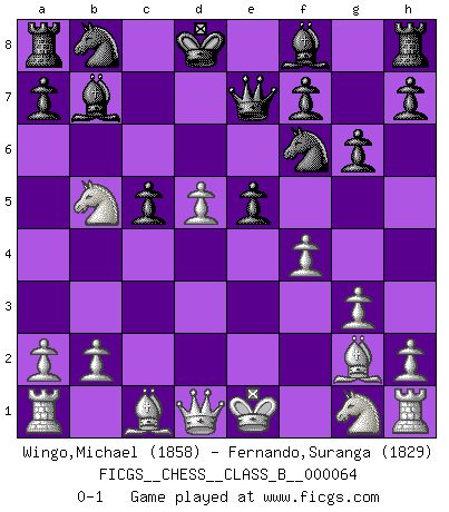 Last move : 0-1 2009 March 30 1:33:27 [Event "FICGS__CHESS__CLASS_B__000064"] [Site "FICGS"] [Date "2008.12.16"] [Round "1"] [White "Wingo,Michael"] [Black "Fernando,Suranga"] [Result "0-1"] [WhiteElo "1858"] [BlackElo "1829"] 1.d4 Nf6 2.c4 e6 3.g3 c5 4.d5 exd5 5.cxd5 b5 6.Bg2 d6 7.e4 Bb7 8.f4 g6 9.e5 Qe7 10.Nc3 dxe5 11.Nxb5 Kd8 0-1 This chess game has been lost on time (started : 2008.12.16 14:8:2) Catalan Opening Player Black won this chess game. Follow this game move after move (download)Not all artists are Chess players, but all Chess players are artists. (Marcel Duchamp) Im Leben werden Partien nie so unstrittig gewonnen wie im Spiel (Emanuel Lasker) Con o sin el título, Bobby Fischer fue sin lugar a dudas el mas grande jugador de su época. (Burt Hochberg) A chaque perte on perd un peu de soi. (Joël Lautier) Hello Thibault, if I have had a plan (and I had one, I hope), I have forgotten it during the last week... - Hello Heinz-Georg. What do you mean a plan ? (Anonymous players, during a Big Chess game)