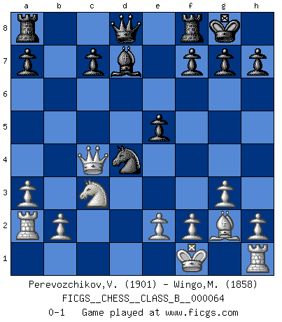 Last move : 0-1 2009 February 5 7:56:45 [Event "FICGS__CHESS__CLASS_B__000064"] [Site "FICGS"] [Date "2008.12.16"] [Round "1"] [White "Perevozchikov,Vjacheslav"] [Black "Wingo,Michael"] [Result "0-1"] [WhiteElo "1901"] [BlackElo "1858"] 1.d4 e6 2.c4 Nf6 3.Nf3 d5 4.g3 dxc4 5.Bg2 Nc6 6.Qa4 Bb4+ 7.Bd2 Nd5 8.Bxb4 Ndxb4 9.a3 b5 10.Qxb5 Nc2+ 11.Kf1 Bd7 12.Ra2 N2xd4 13.Qxc4 e5 14.Nxd4 Nxd4 15.Nc3 O-O 0-1 Queen's pawn Kingside Castling by player Black (move 15) Player Black won this chess game. Follow this game move after move (download)One of these modest little moves may be more embarrassing to your opponent than the biggest threat. (Siegbert Tarrasch) Schach ist mein Leben, meine Leidenschaft, was ich gelernt habe und seit meinem 14. Lebensjahr profimässig praktiziere. Darauf zu verzichten, würde mir sehr schwer fallen. (Viktor Kortschnoi) El Ajedrez es la vida. (Bobby Fischer) En blitz, le Cavalier l'emporte sur le Fou. (Vlastimil Hort) To steal ideas from one person is plagiarism. To steal from many is research. (Unknown)